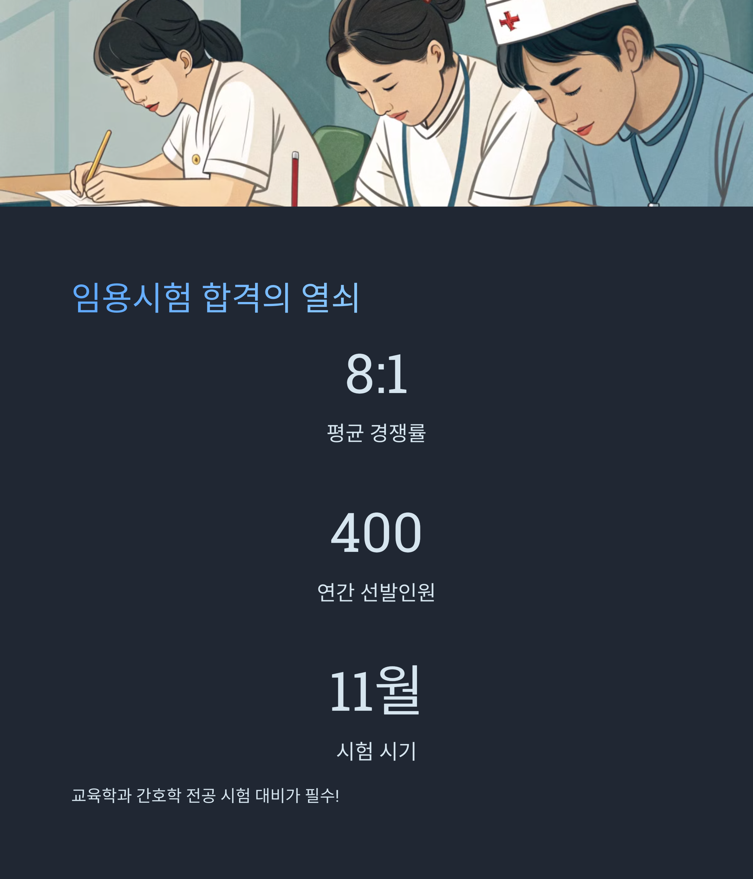- 응시 자격: 간호사 면허증, 교원 자격증 소지 여부