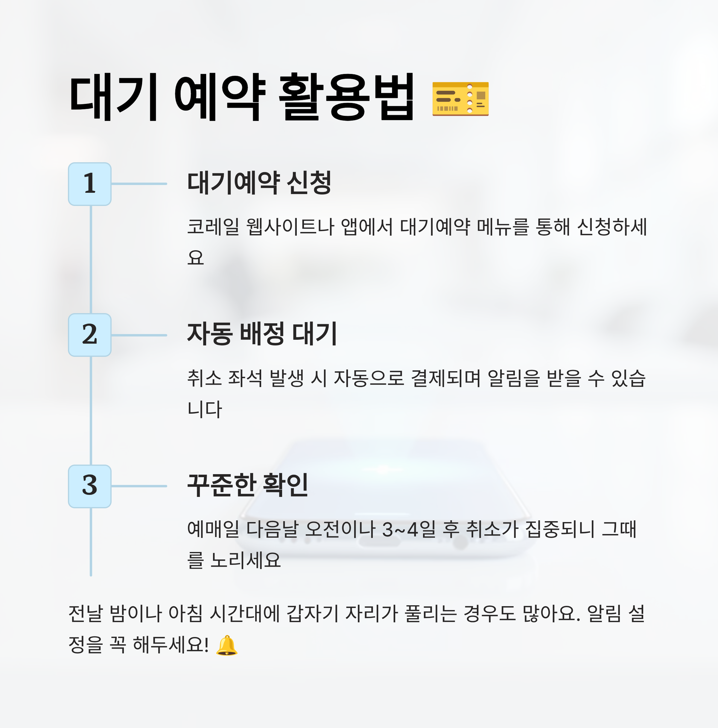 대기예약은 코레일 웹사이트 또는 앱에서 **[대기예약]** 메뉴를 통해 신청할 수 있고, 성공 시 자동으로 결제되며 알림도 받을 수 있어요.