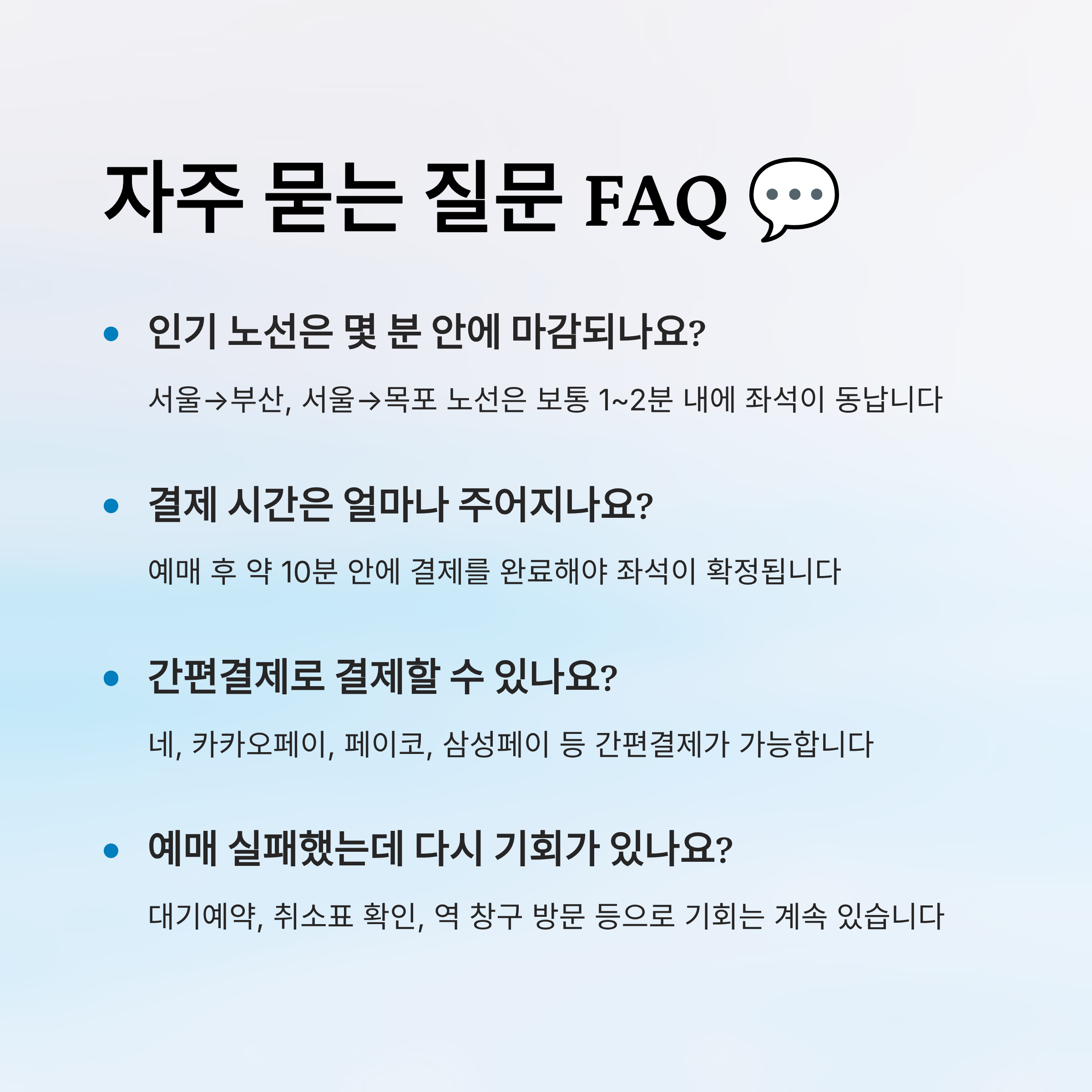 A3. 서울→부산, 서울→목포 노선은 보통 1~2분 내에 좌석이 동나요. 미리 준비가 필수예요!
