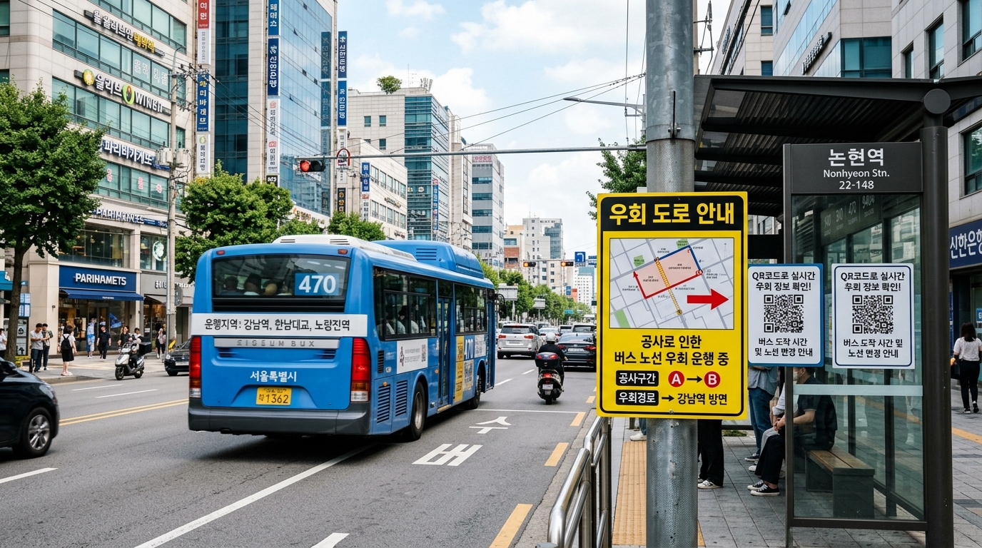 각 버스 정류소에 부착된 QR코드를 스캔하면 해당 정류소를 지나는 버스들의 우회 경로를 실시간으로 확인할 수 있습니다. 네이버 지도나 카카오맵 앱에서도 '우회' 표시가 뜨니 이동 전에 반드시 경로를 재검색해 보세요.