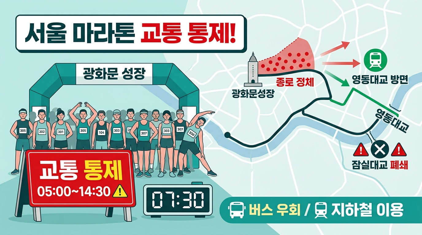 [2026 서울마라톤 교통통제 완벽 가이드] 3월 15일 일요일, 광화문부터 잠실까지 서울 도심이 마라톤 열기로 가득 찹니다. 도로 통제 시간과 버스 우회 노선, 지하철 이용 꿀팁까지 한눈에 확인하고 당황스러운 주말 이동을 미리 대비하세요! 🏃‍♂️💨