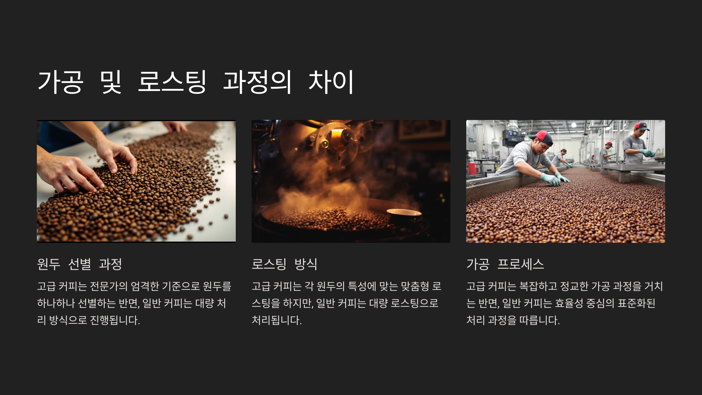 - 고급 커피는 로스터들이 원두의 특성과 산지를 고려하여 맞춤형 로스팅을 진행합니다.