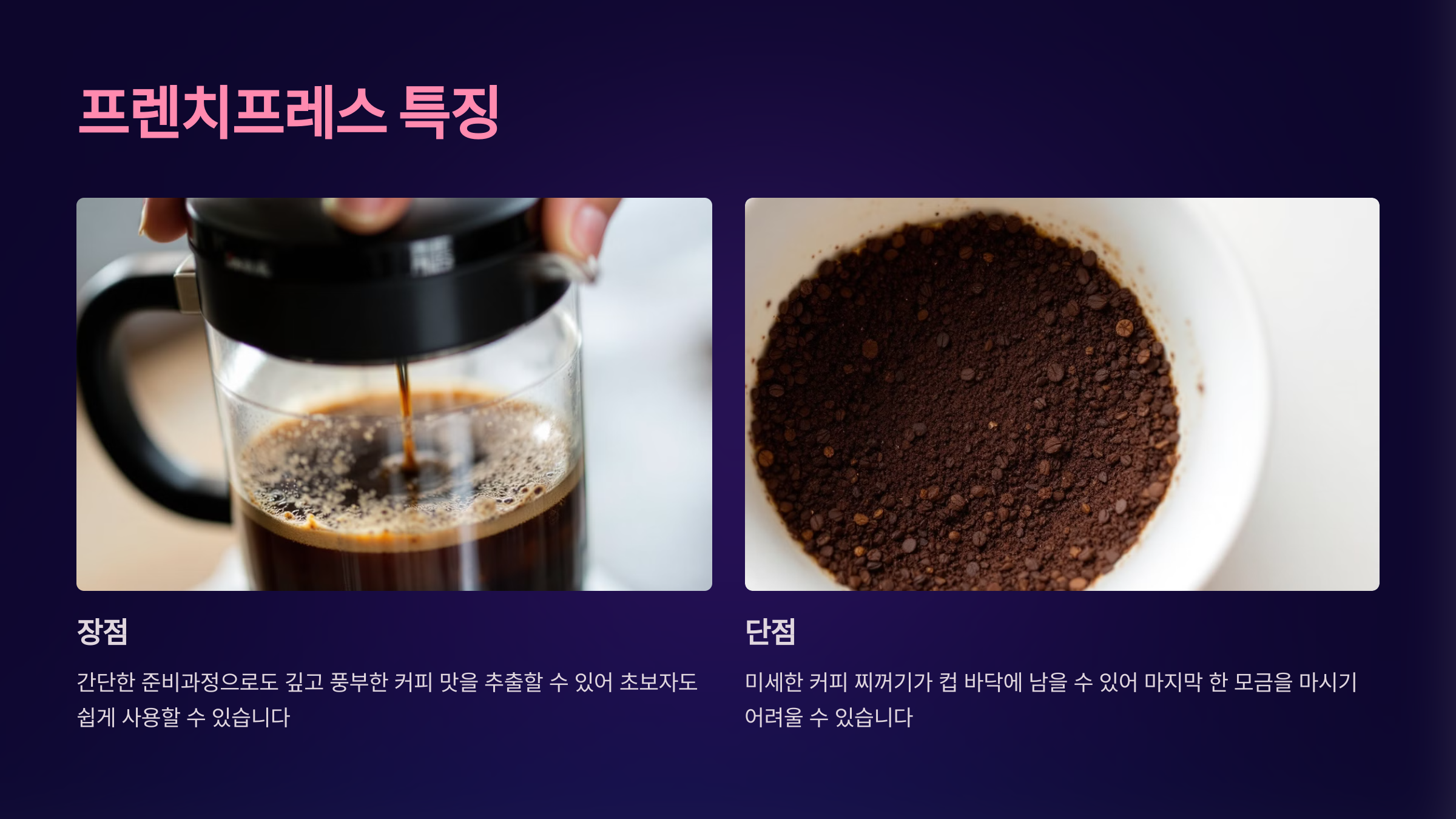 프렌치프레스 | 묵직하고 깊은 맛 | 진한 풍미를 선호하는 분 | 간단한 사용법, 풍부한 질감 | 커피 찌꺼기 남을 가능성 |