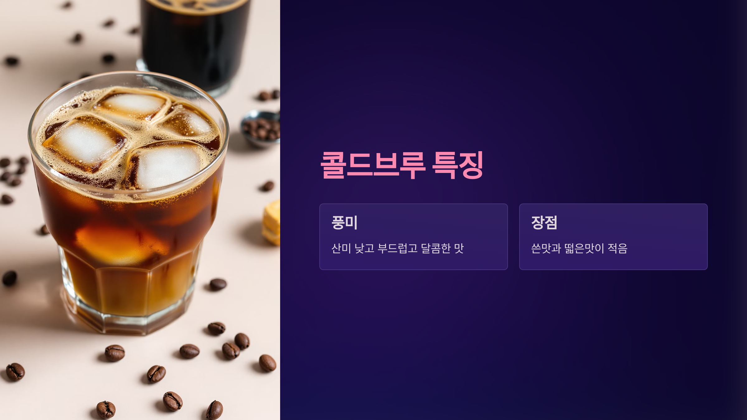 콜드브루 | 부드럽고 단맛 | 여름철 커피를 즐기는 분 | 쓴맛 적고 부드러운 풍미 | 긴 준비 시간 필요 |