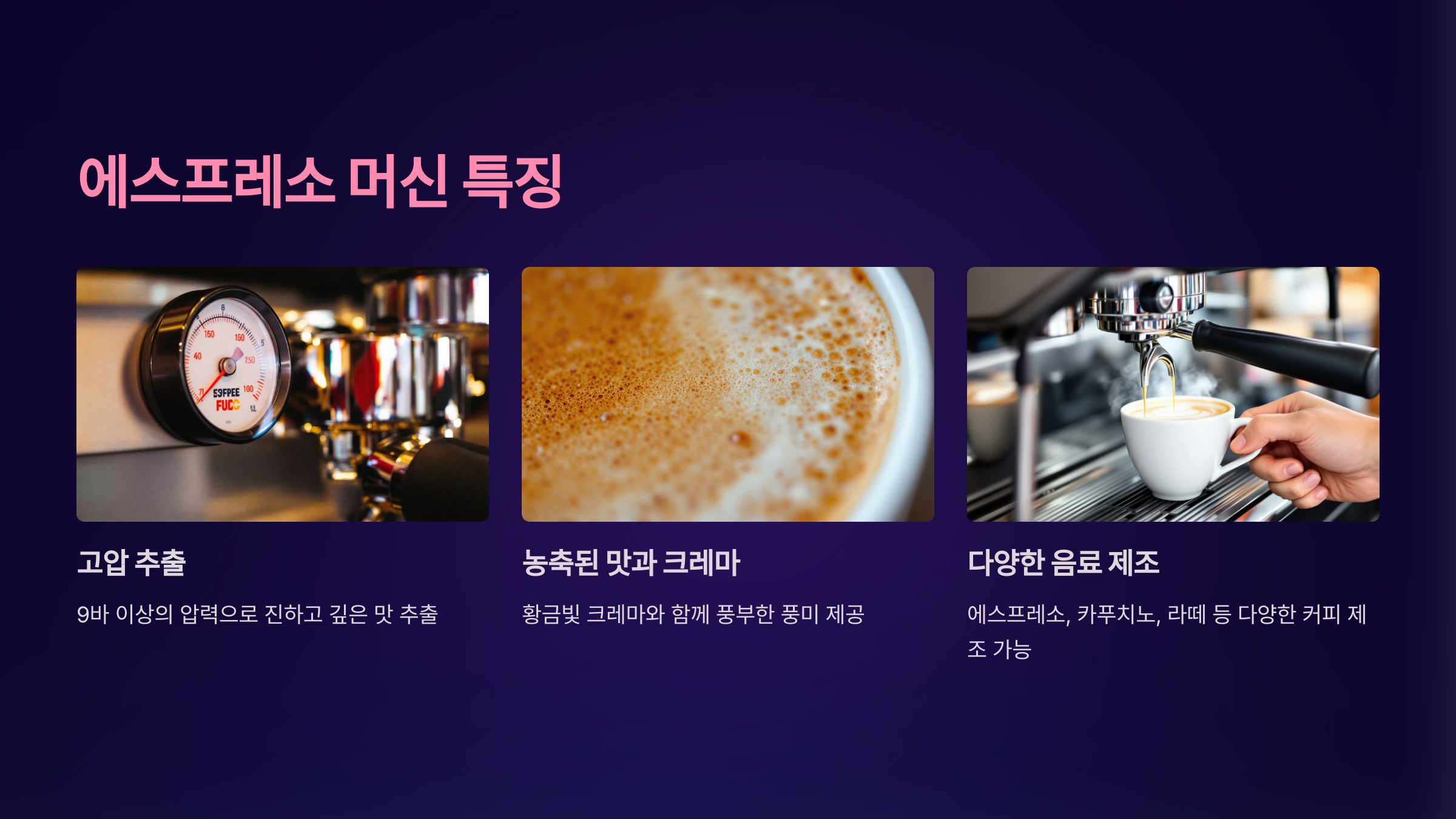 에스프레소 머신은 고압으로 빠르게 커피를 추출하는 기계입니다.