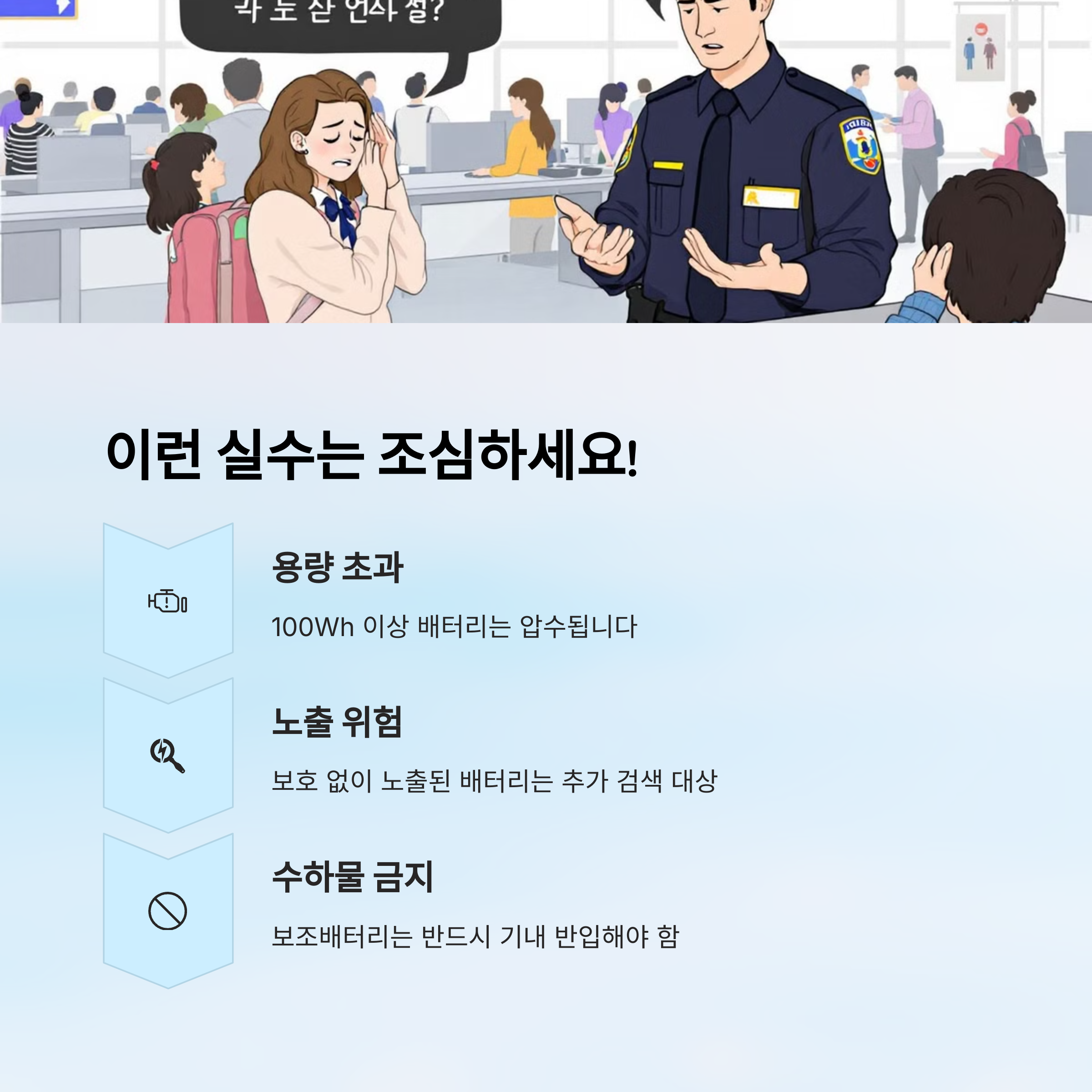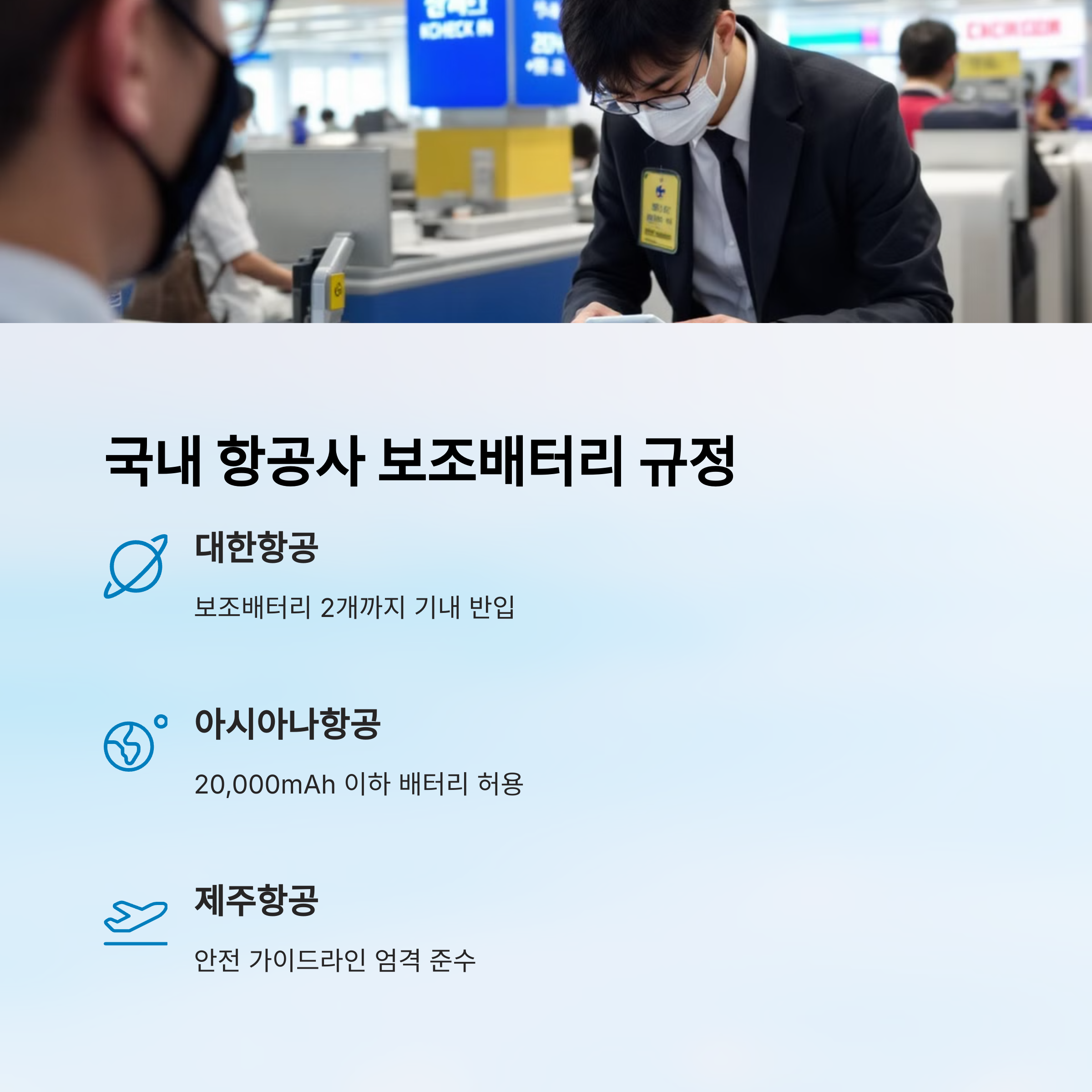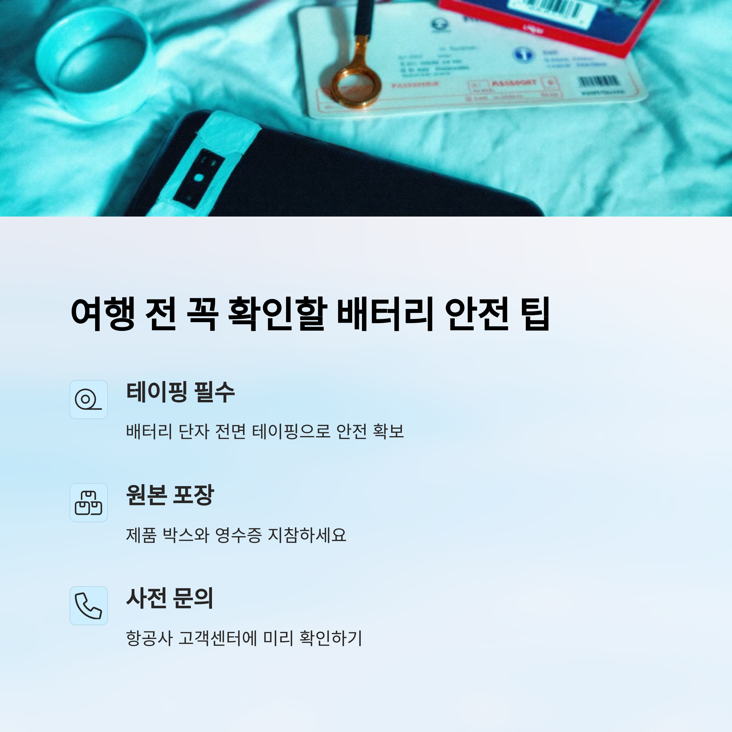 국내 항공사 이용 시 가장 좋은 팁은 '무조건 기내 반입', '용량 표기된 보조배터리만 사용', '2개 이하로 준비'하는 것이에요. 여기에 더해 파우치나 케이스로 단자를 보호해 두면 더 완벽하죠!