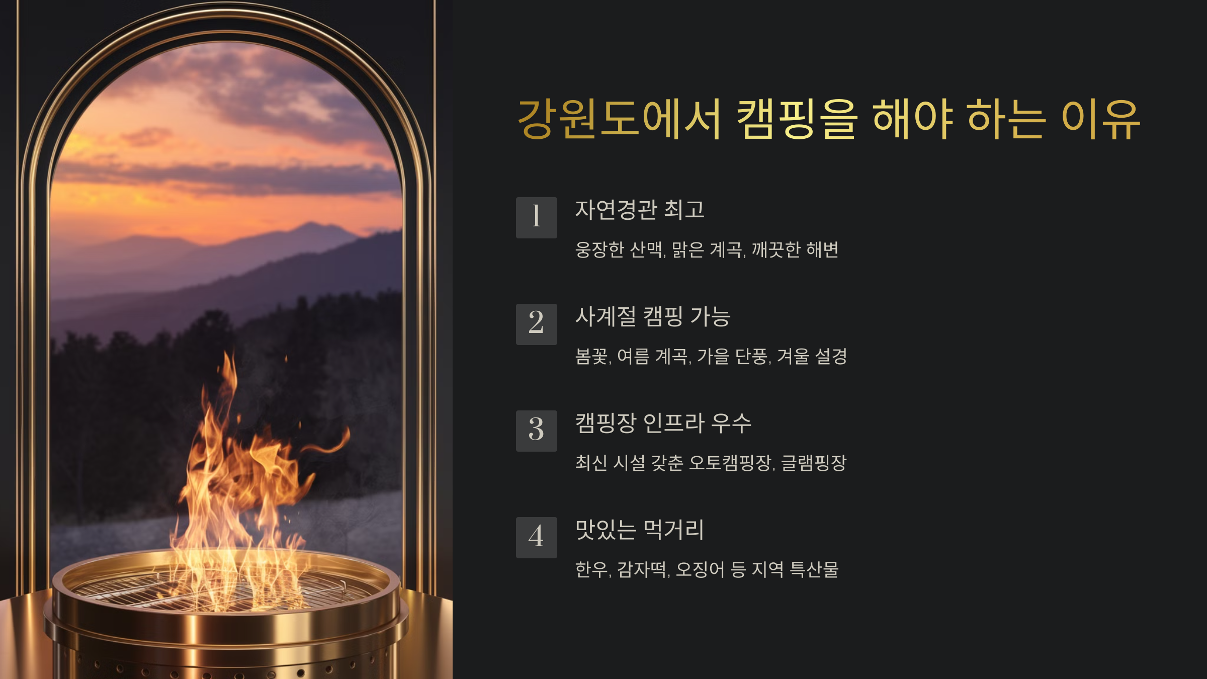 강원도는 국내에서 가장 아름다운 자연을 품고 있는 지역이에요. 🌿🏕️ **캠핑을 하기에 최적의 조건을 갖춘 곳**이죠! 😊