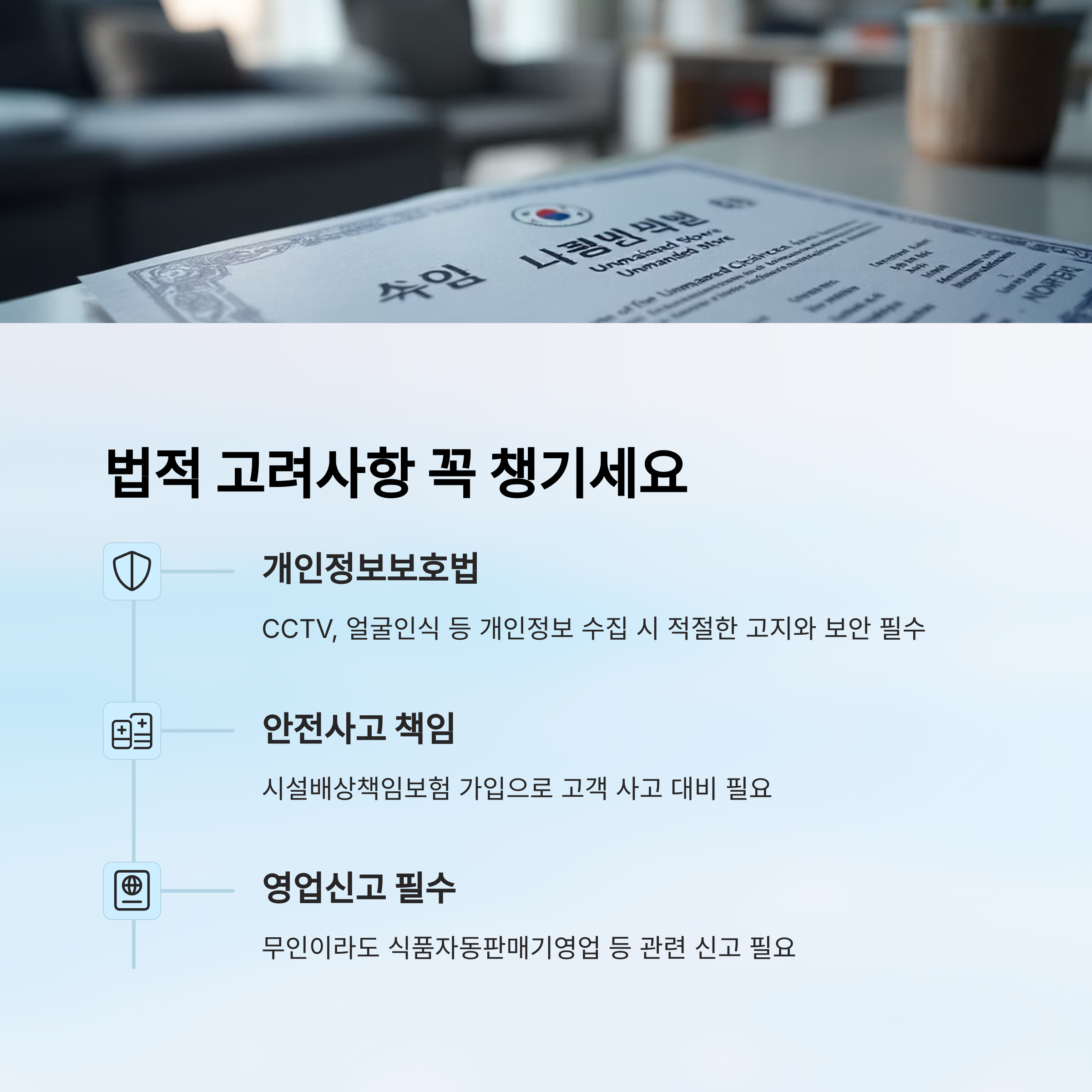 무인 창업을 준비할 때 간과하기 쉬운 부분이 바로 법적인 문제예요. 사람 없이 운영된다고 해서 법적 책임까지 사라지는 건 아니니까요. 오히려 더 철저히 지켜야 할 기준들이 있어요. 오늘은 무인 매장 운영 시 꼭 챙겨야 할 법적 요소들을 정리해볼게요.
