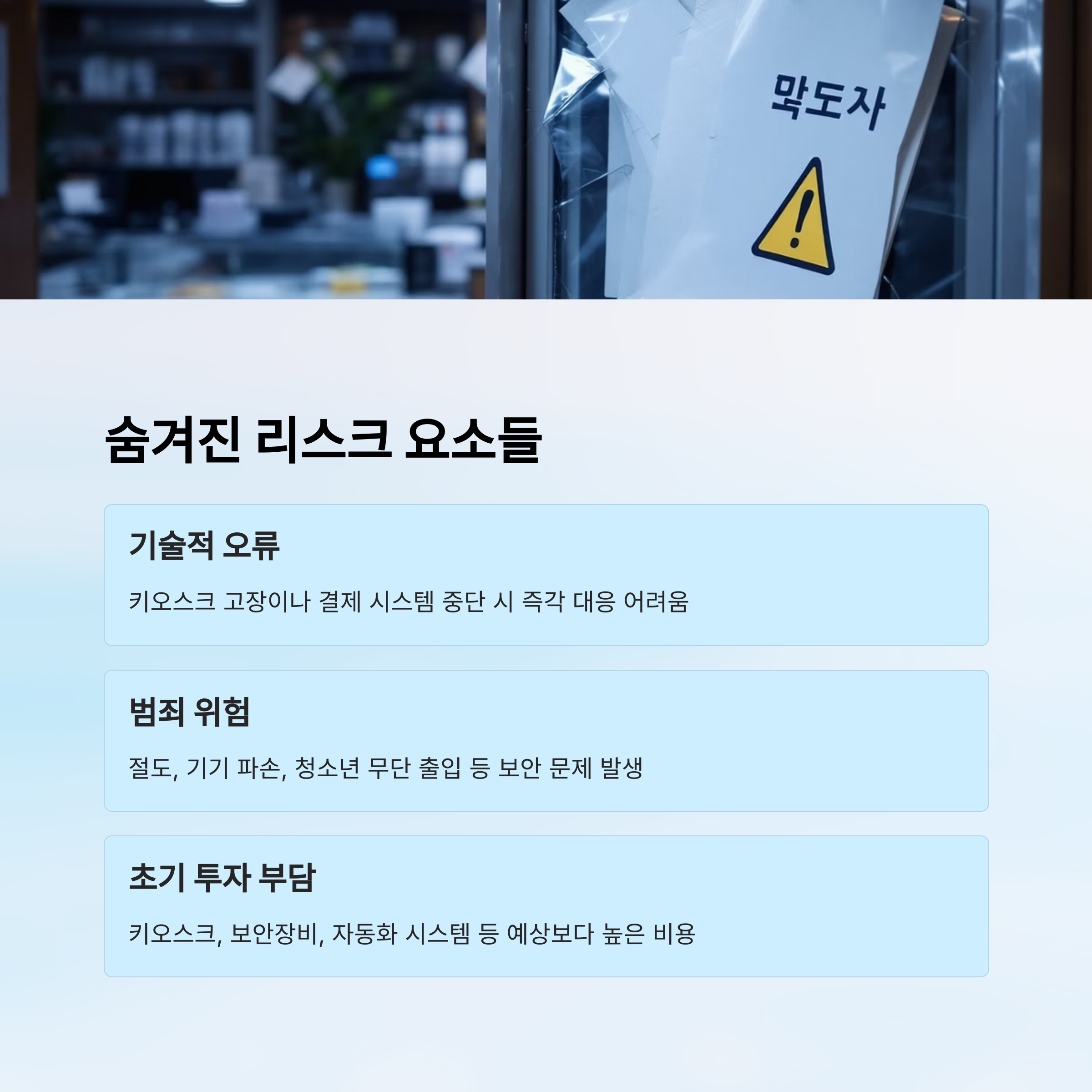 무인 창업은 겉으로 보기엔 간편하고 수익성도 높아 보여요. 하지만 실질적인 운영에 들어가면 예상치 못한 리스크가 도사리고 있어요. 특히 기술 의존도가 높은 만큼 시스템 오류나 고장이 생기면 매출 손실로 직결되죠.