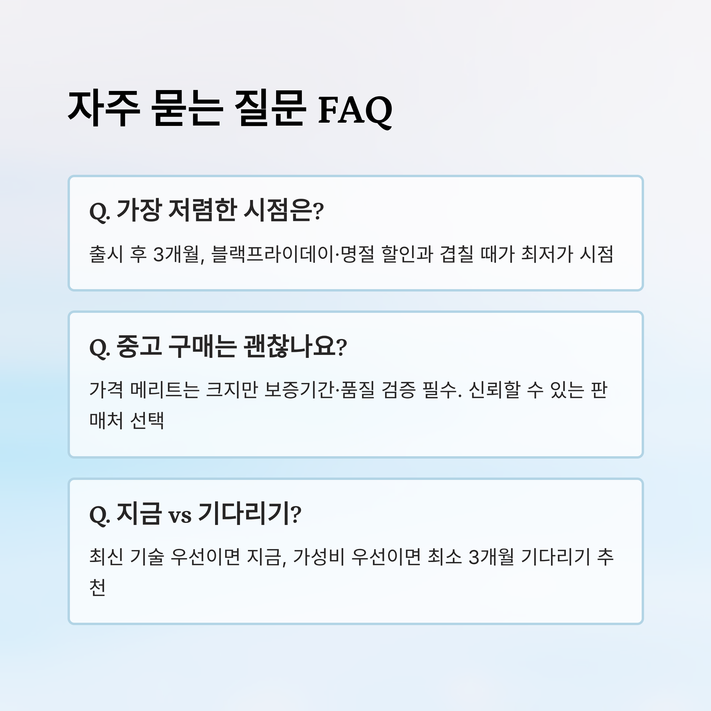 A8. 최신 기술을 바로 쓰고 싶다면 지금이 맞고, 가성비를 최우선으로 한다면 최소 3개월 이상 기다리는 걸 추천해요.