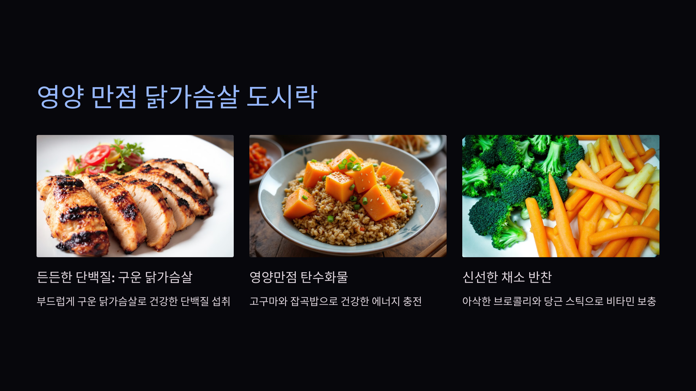 - 닭가슴살은 전날 구워 놓고, 아침에 살짝 데워 보온 도시락에 담아주세요.