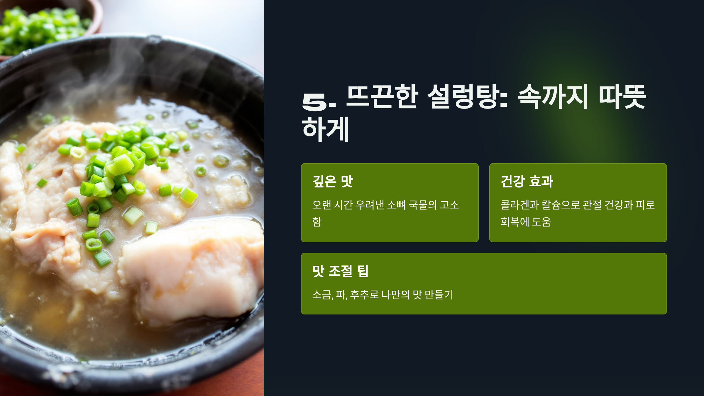 - 추천 이유: 설렁탕의 콜라겐과 칼슘은 관절 건강에 좋고, 겨울철 피로 회복에도 도움을 줍니다.