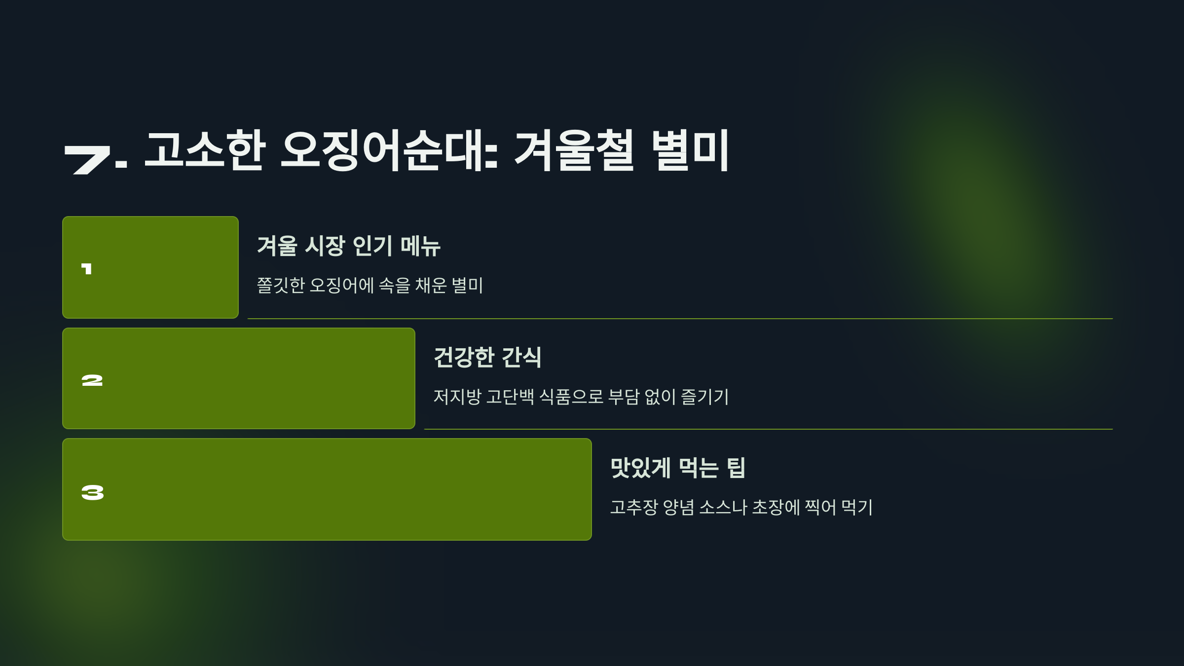 - 추천 이유: 오징어는 저지방 고단백 식품으로, 부담 없이 즐길 수 있는 건강한 간식이에요.