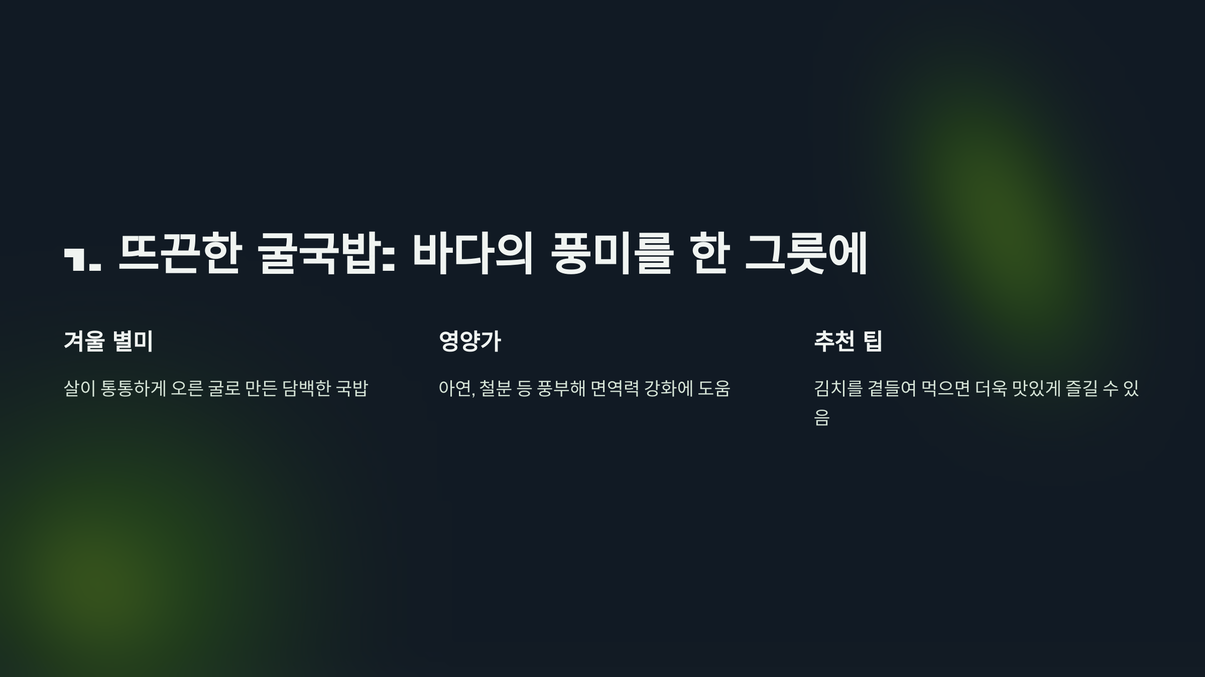 - 추천 이유: 굴에는 아연, 철분 등 영양소가 풍부해 겨울철 면역력 강화에 도움을 줘요.