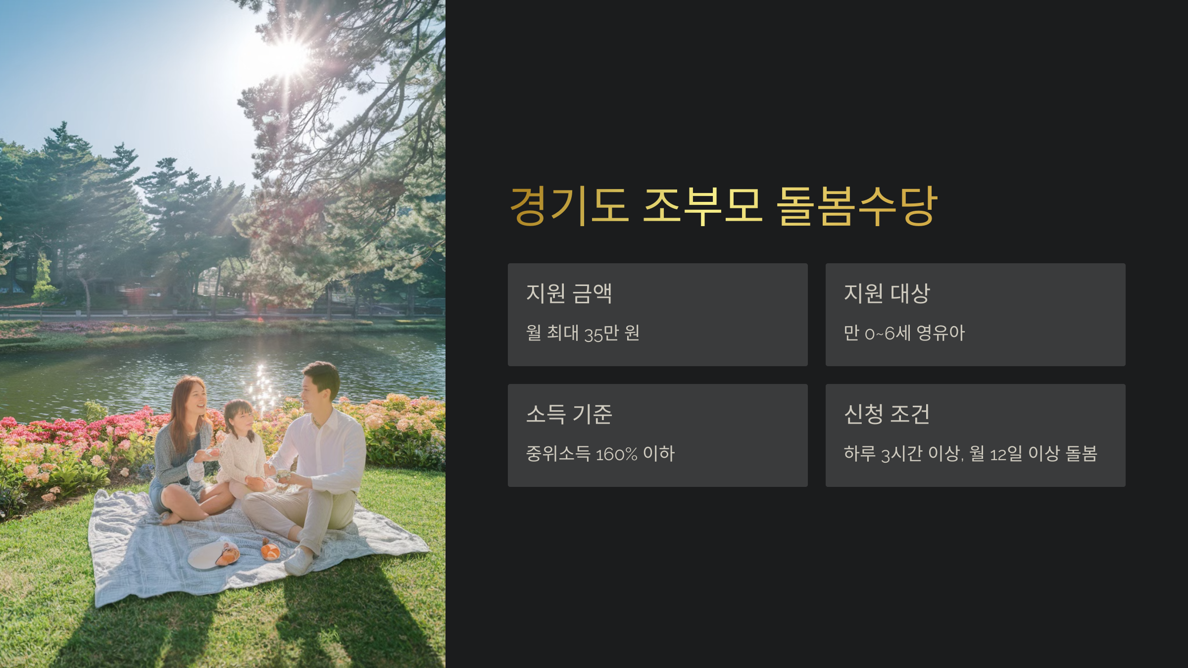 | 경기도 | 최대 35만 원 | 0~6세 | 중위소득 160% 이하 | 하루 3시간 이상 |