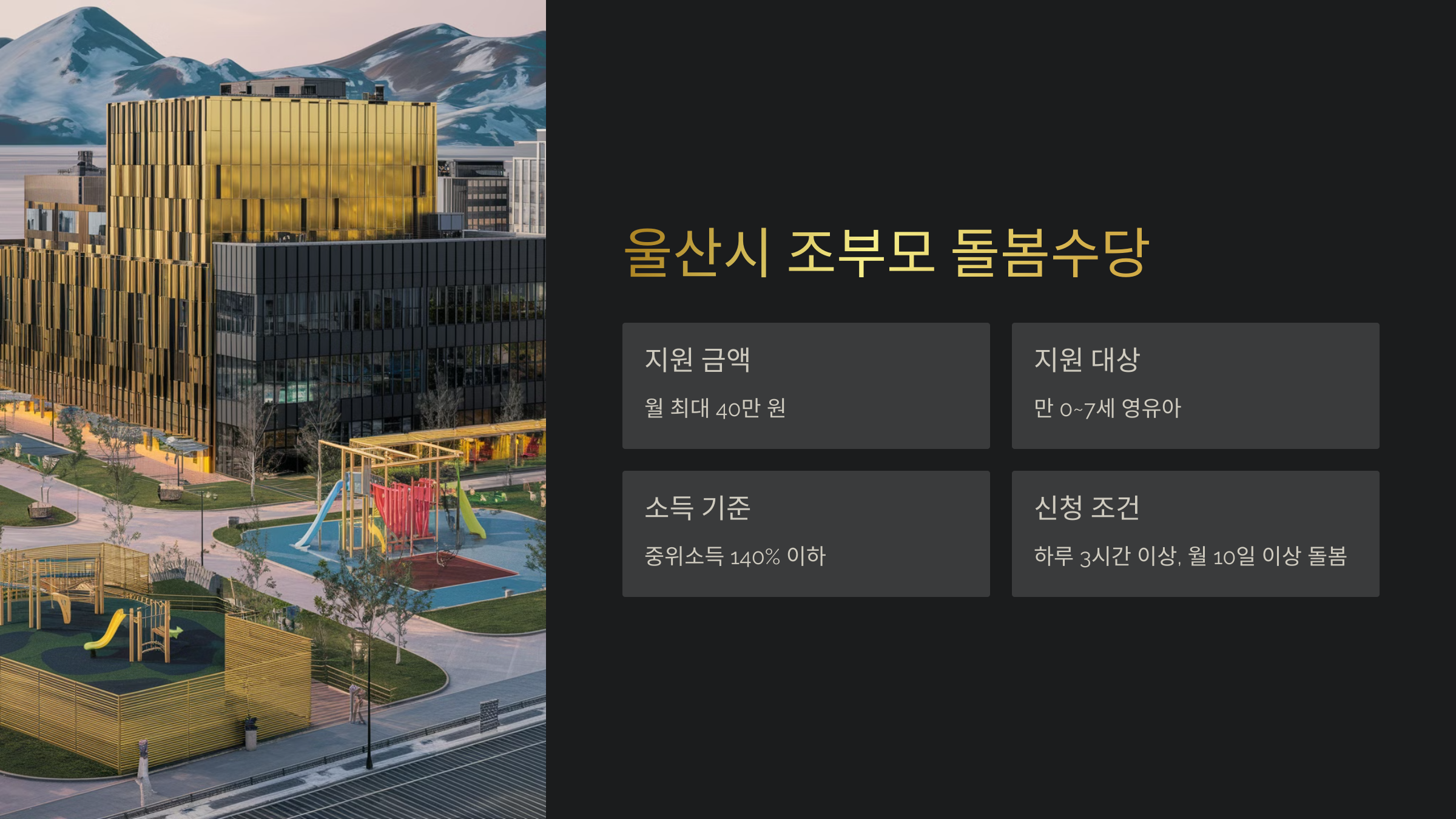 울산은 서울, 경기도보다 지원 금액이 가장 높고, 신청 조건이 비교적 유연한 편이에요. 하지만 지원 대상이 조손가정 중심으로 이루어질 가능성이 높아서, 일반 맞벌이 가정은 신청이 어려울 수도 있어요. 🏠