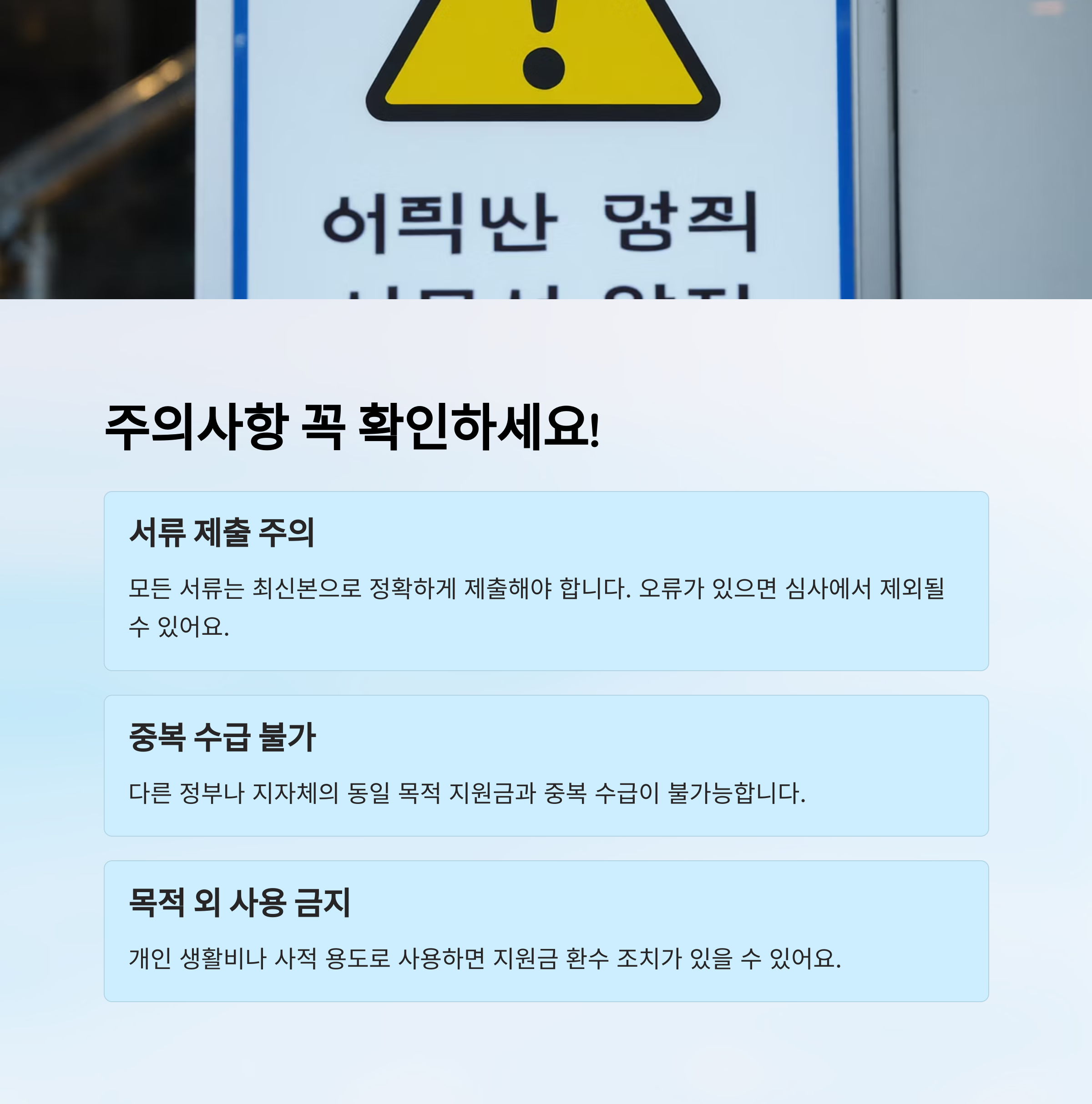 경기여성취업지원금 신청 시 몇 가지 꼭 기억해야 할 중요한 유의사항이 있어요. 단순한 실수로 좋은 기회를 놓치지 않도록 아래 내용을 꼼꼼히 확인해보세요! 😊