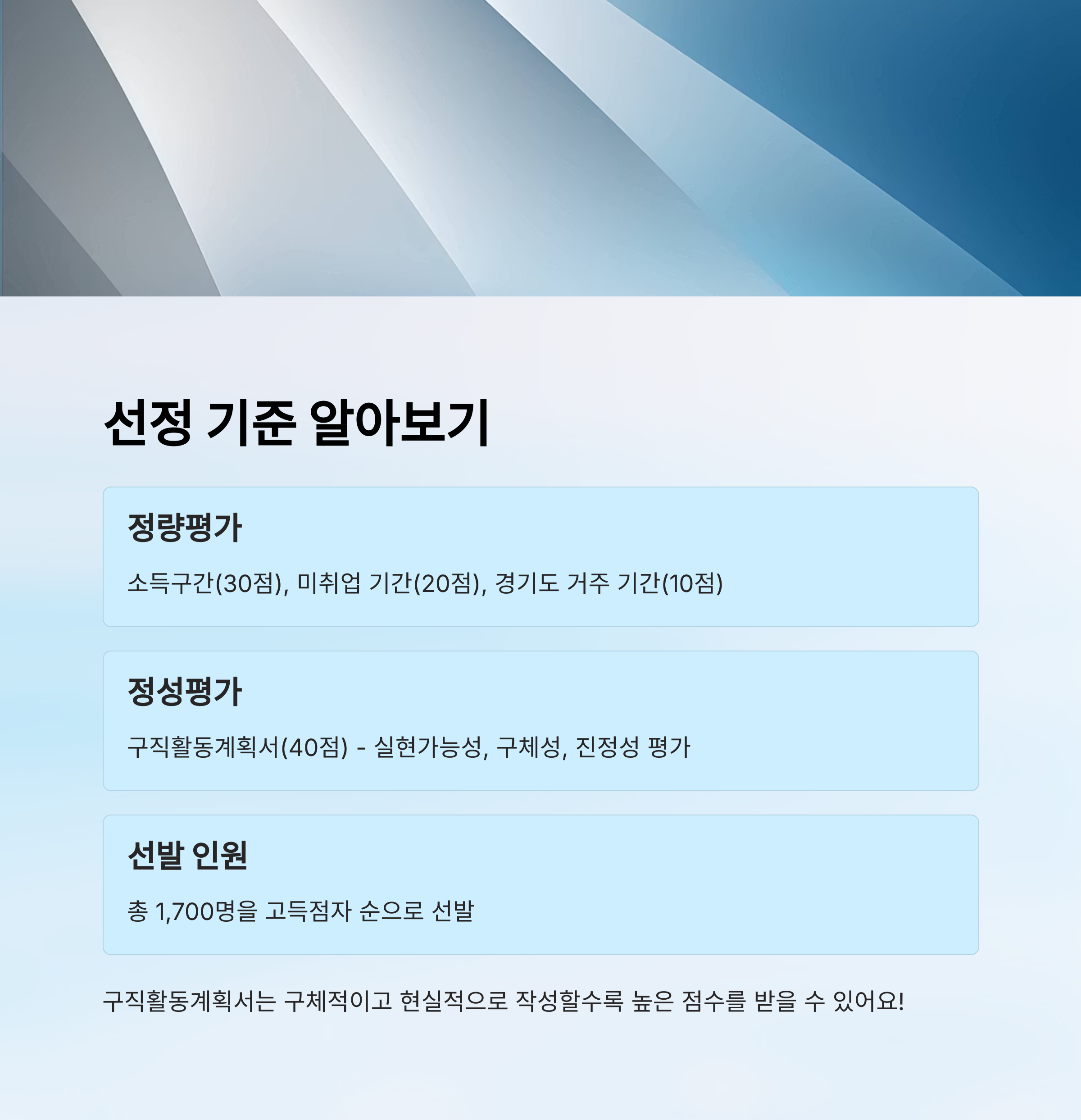예를 들어, 구직활동계획서가 아주 구체적이고 현실적이면 최고점 40점을 받을 수 있어요. 거기에 소득이 낮고, 미취업 기간이 길며, 경기도에 오래 거주했다면 당연히 상위권으로 선정될 가능성이 크겠죠!