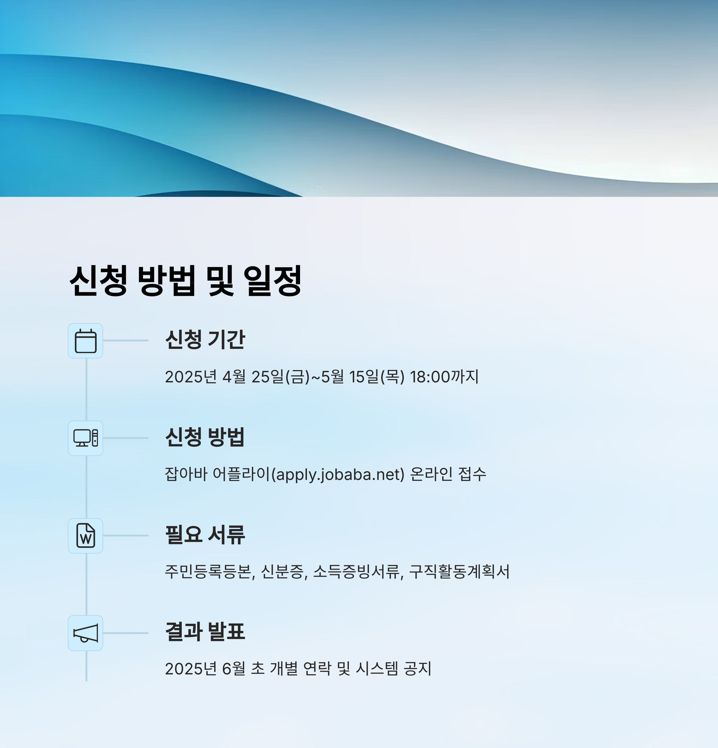 📅 신청 기간은 2025년 4월 25일(금)부터 5월 15일(목) 18:00까지예요. 마지막 날 오후 6시가 지나면 접수가 종료되므로, 마감 직전엔 서버 폭주 등 문제가 생길 수 있으니 반드시 여유 있게 신청하는 게 좋아요!