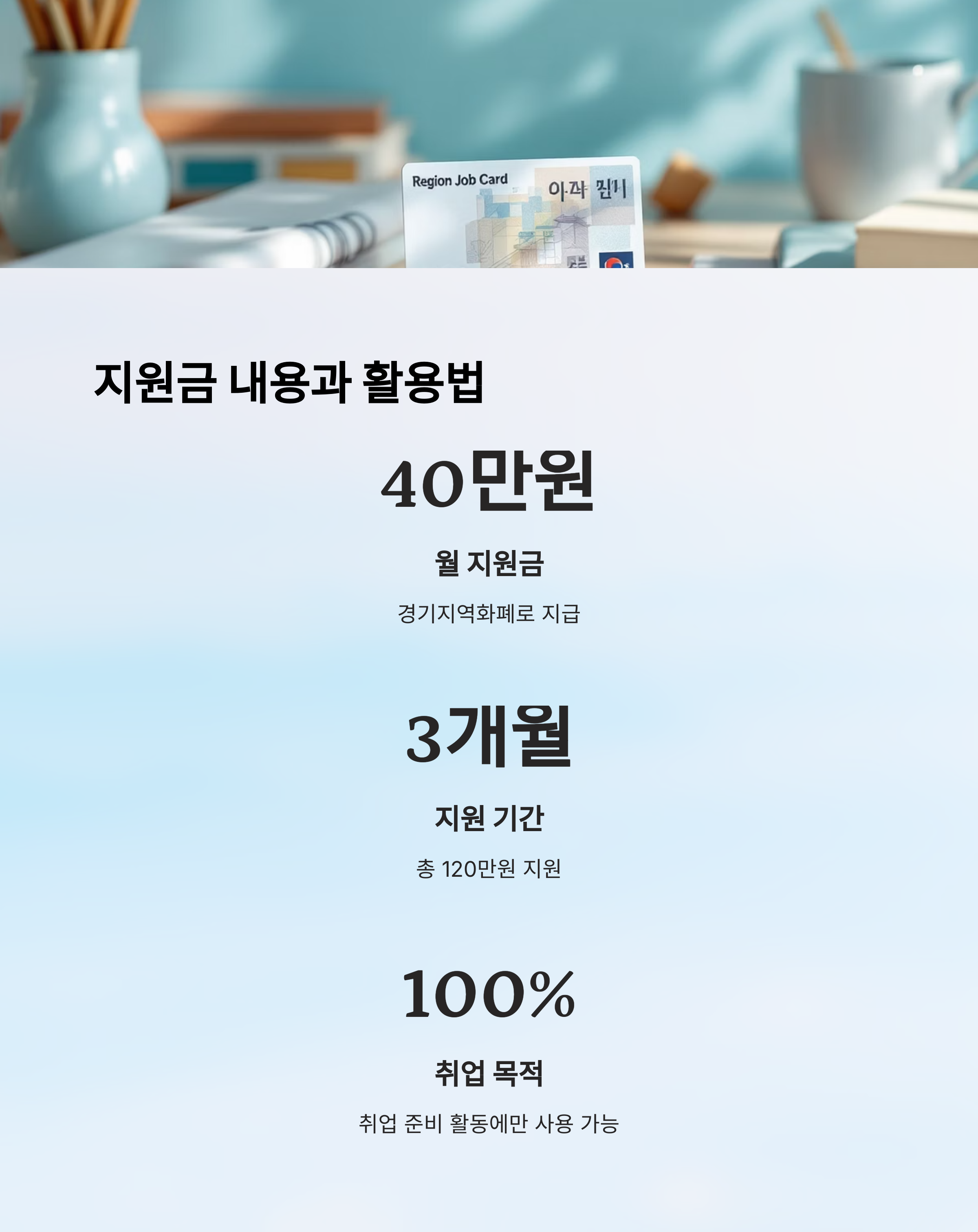 2025년 경기여성취업지원금은 단순히 ‘돈만 주는’ 제도가 아니에요. 이 사업의 진짜 핵심은 취업을 실질적으로 지원하기 위한 수단으로써의 자금이라는 점이에요. 선정되면 총 3개월 동안 매월 40만 원씩, 최대 120만 원을 지원받을 수 있어요. 지급 수단은 바로 경기지역화폐예요.