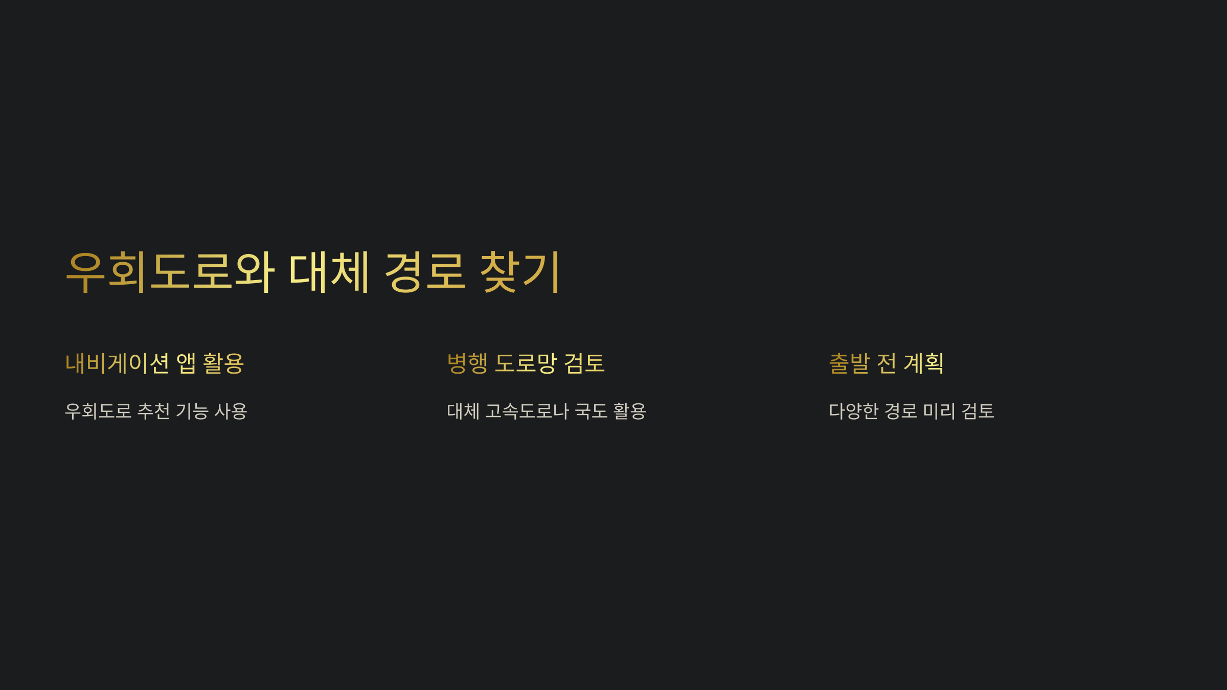 우회도로는 고속도로 정체를 피할 수 있는 훌륭한 대안이에요. 대체 경로는 교통량이 적은 국도나 지방도로를 포함할 수 있어요. 이런 경로들은 시간은 다소 더 걸릴 수 있지만, 정체된 고속도로에서 서행하는 것보다 더 빠를 수 있어요.