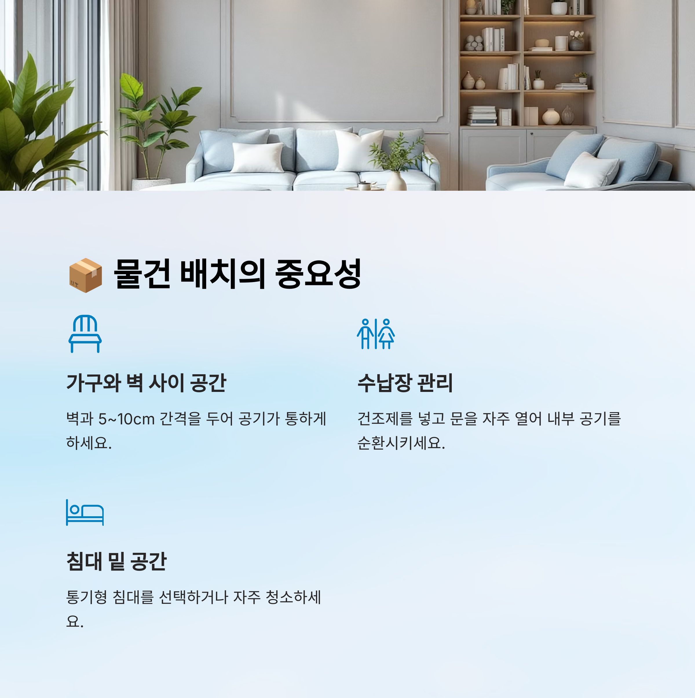 가구는 벽과 약 5~10cm 정도의 간격을 두고 배치하는 것이 좋아요. 그래야 공기가 통하고 습기가 벽에 갇히지 않아요. 특히 외벽과 맞닿은 공간은 온도 차이 때문에 결로가 생기기 쉬운데, 이런 곳에 가구를 바짝 붙이면 곰팡이가 빠르게 번식할 수 있어요.