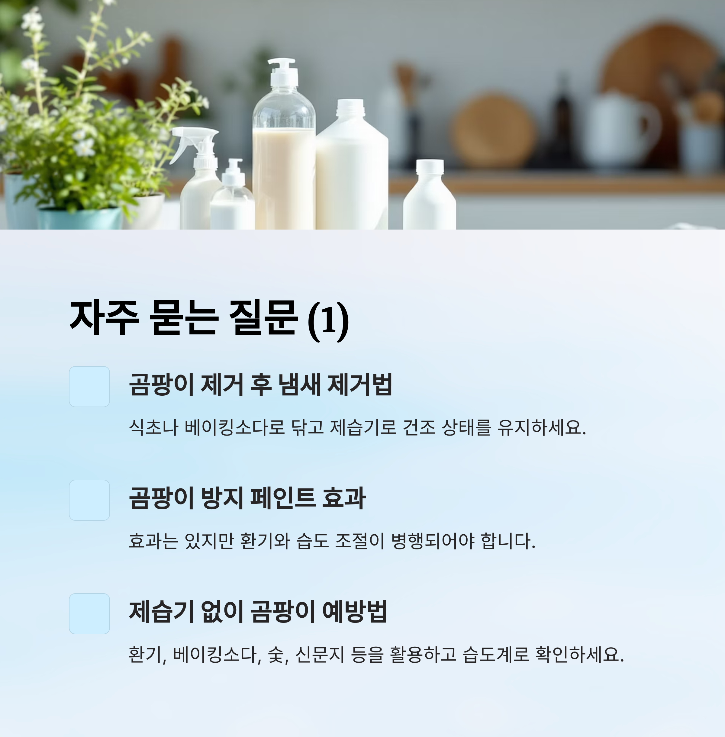 A1. 냄새는 곰팡이 포자나 유기물에서 발생할 수 있어요. 곰팡이 제거 후에도 식초나 베이킹소다로 닦고, 제습기를 활용해 건조 상태를 유지해보세요.