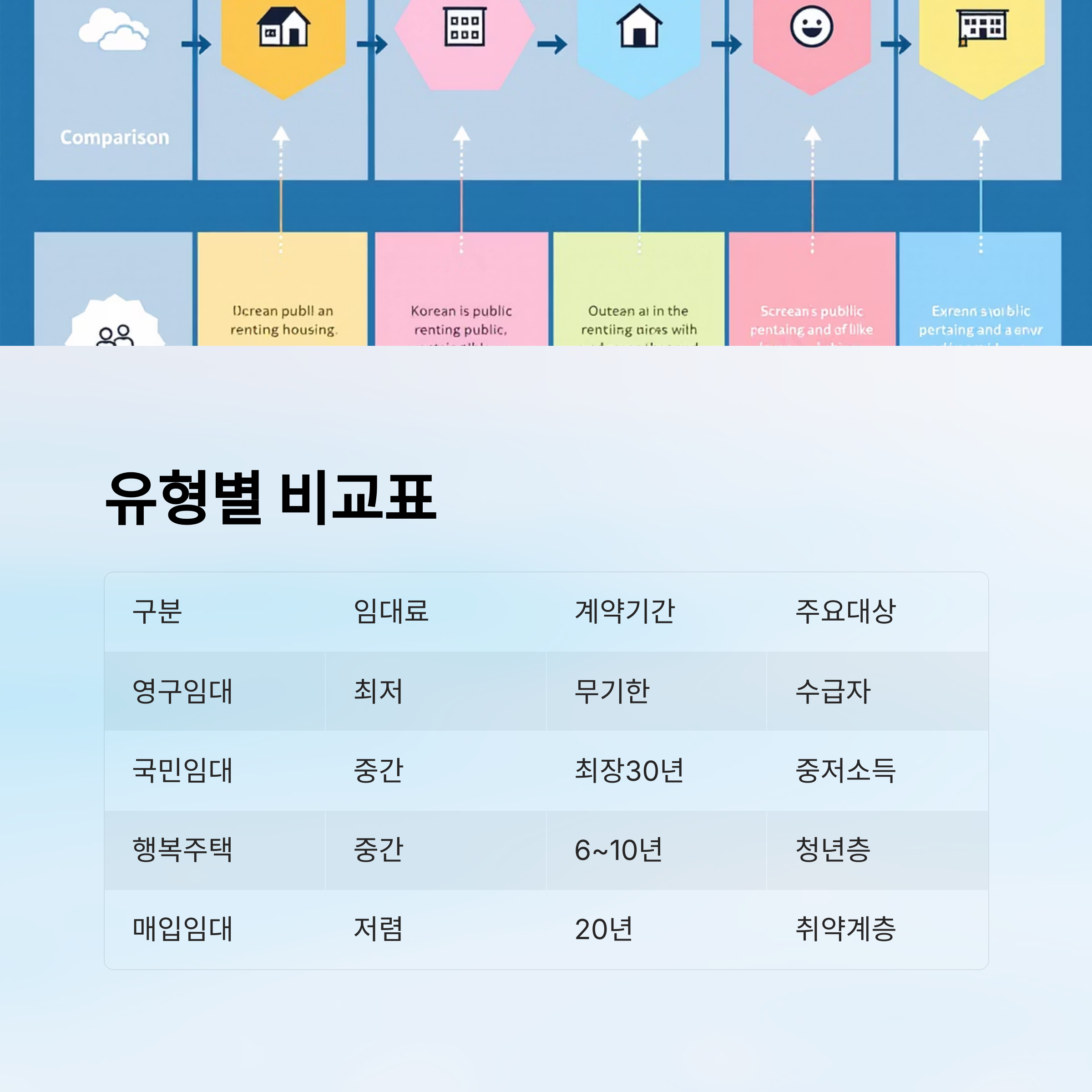 지금까지 소개한 공공임대주택 다섯 가지 유형을 한눈에 비교해볼 수 있는 표예요. 조건, 대상, 거주 기간, 임대료 등 핵심 요소를 정리했어요.