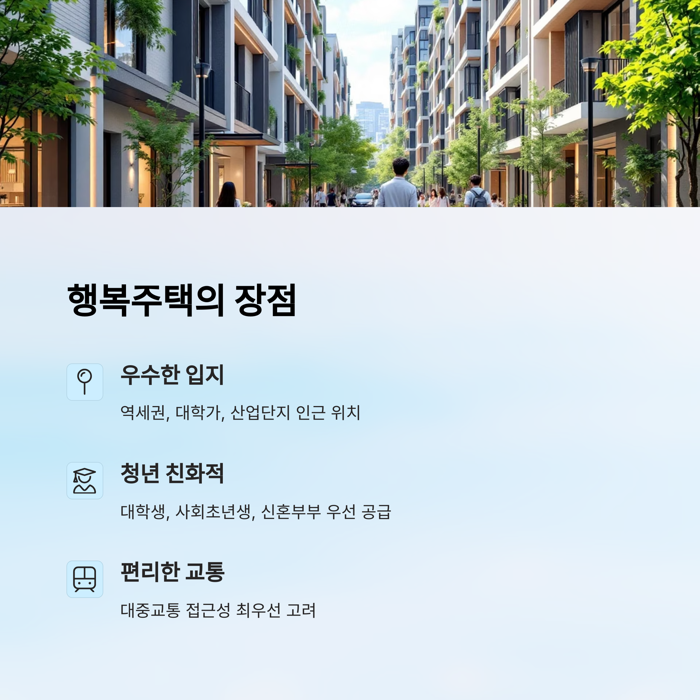 ✔ 청년, 사회초년생, 신혼부부라면 입지 좋고 신축인 행복주택이 딱이에요. 디자인도 만족도 높아요.