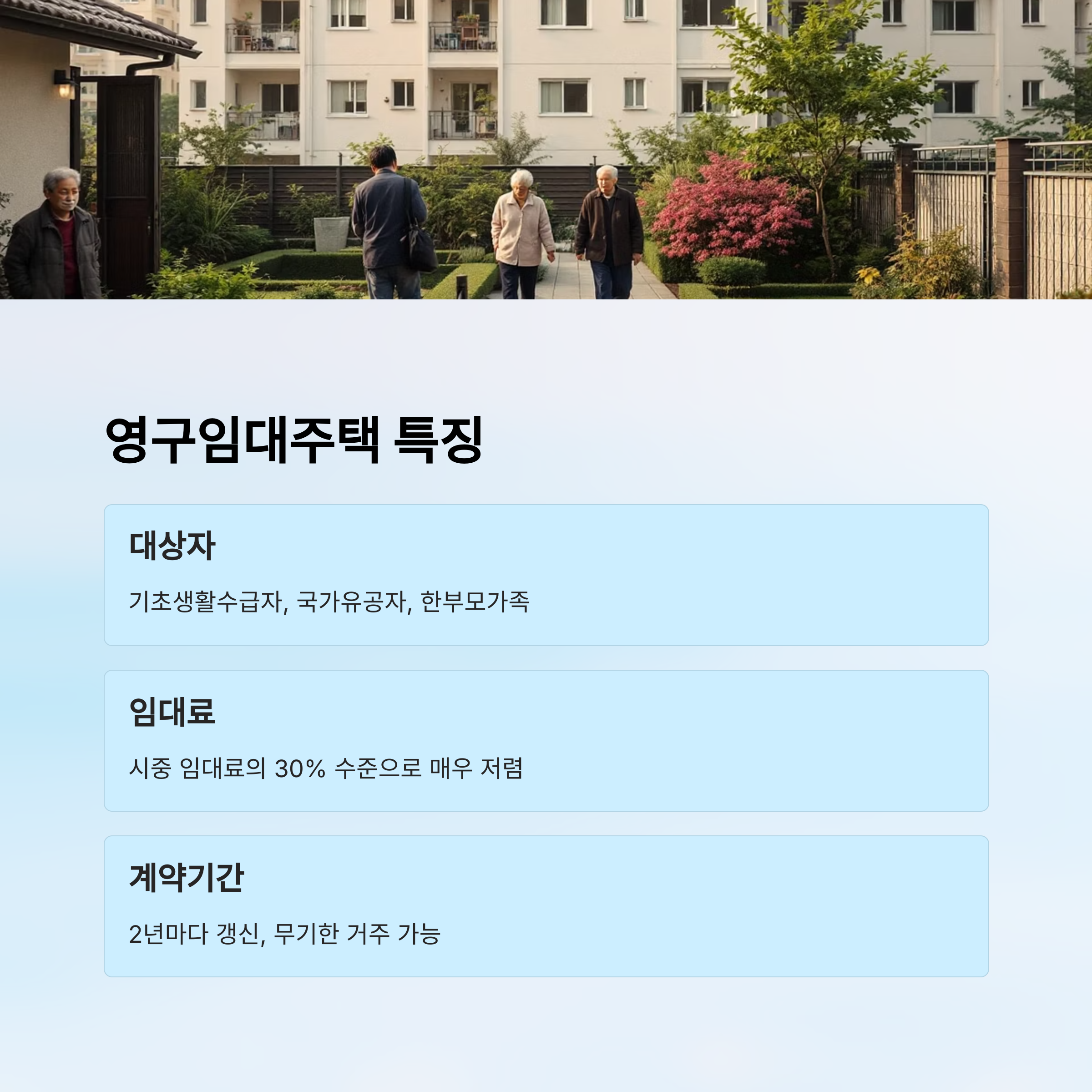영구임대주택은 이름 그대로 ‘영구적으로’ 살 수 있는 공공임대주택이에요. 특히 기초생활수급자, 장애인, 한부모가정, 고령자 등 사회적 약자 계층을 위한 복지형 주택이에요.
