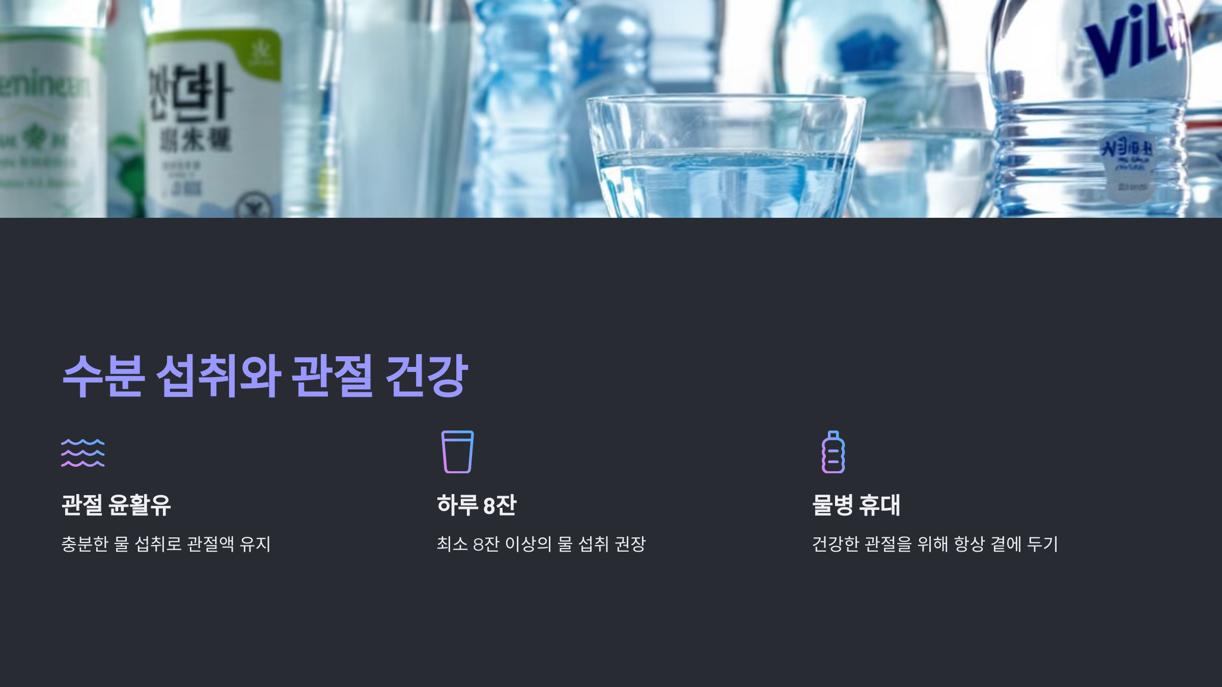 충분한 물 섭취는 관절액의 양을 유지해 관절의 원활한 움직임을 돕습니다.