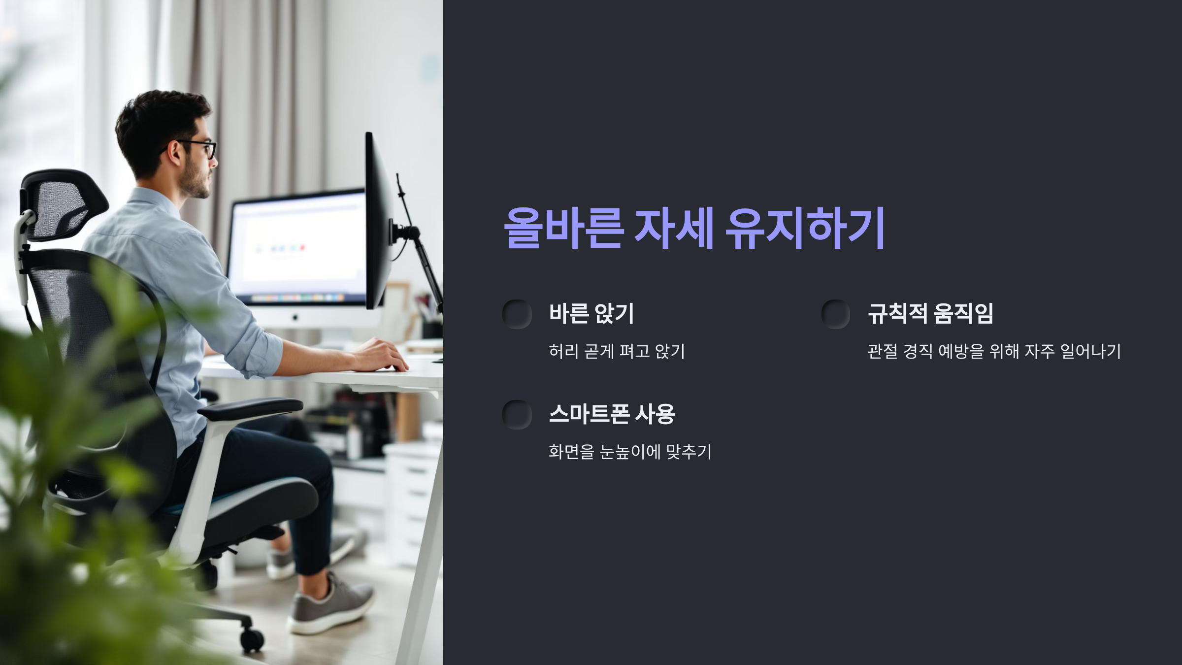 올바른 자세는 관절뿐만 아니라 척추 건강에도 긍정적입니다.