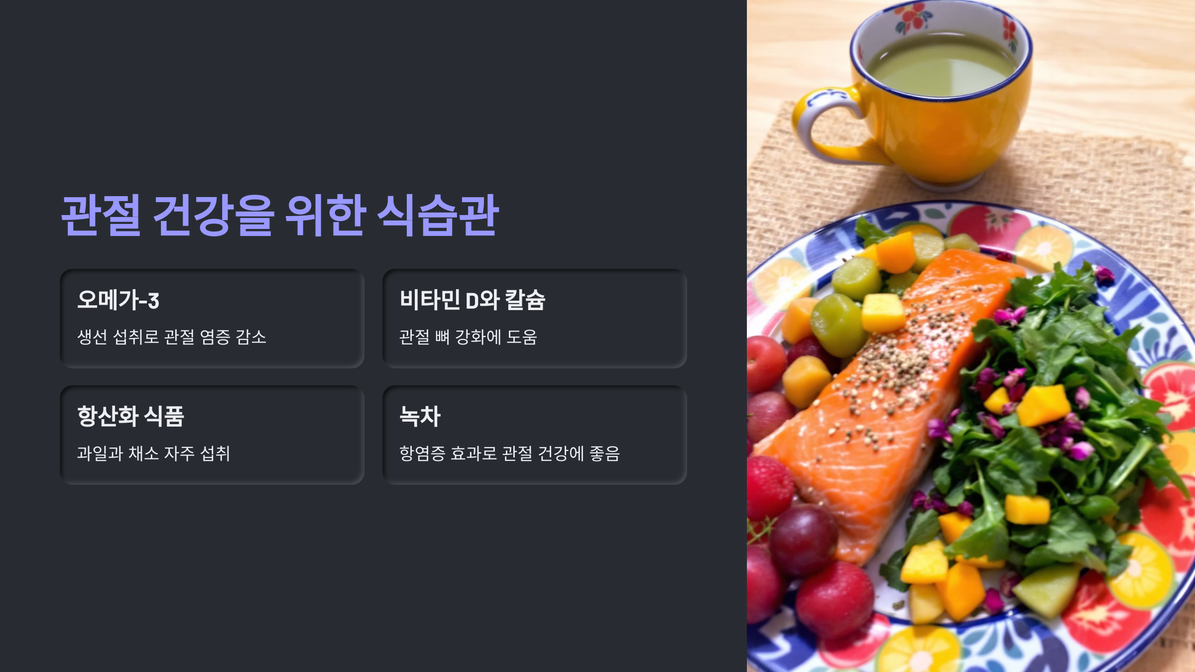 비타민 D와 칼슘이 풍부한 음식을 먹어 관절 뼈를 튼튼하게 유지하세요.