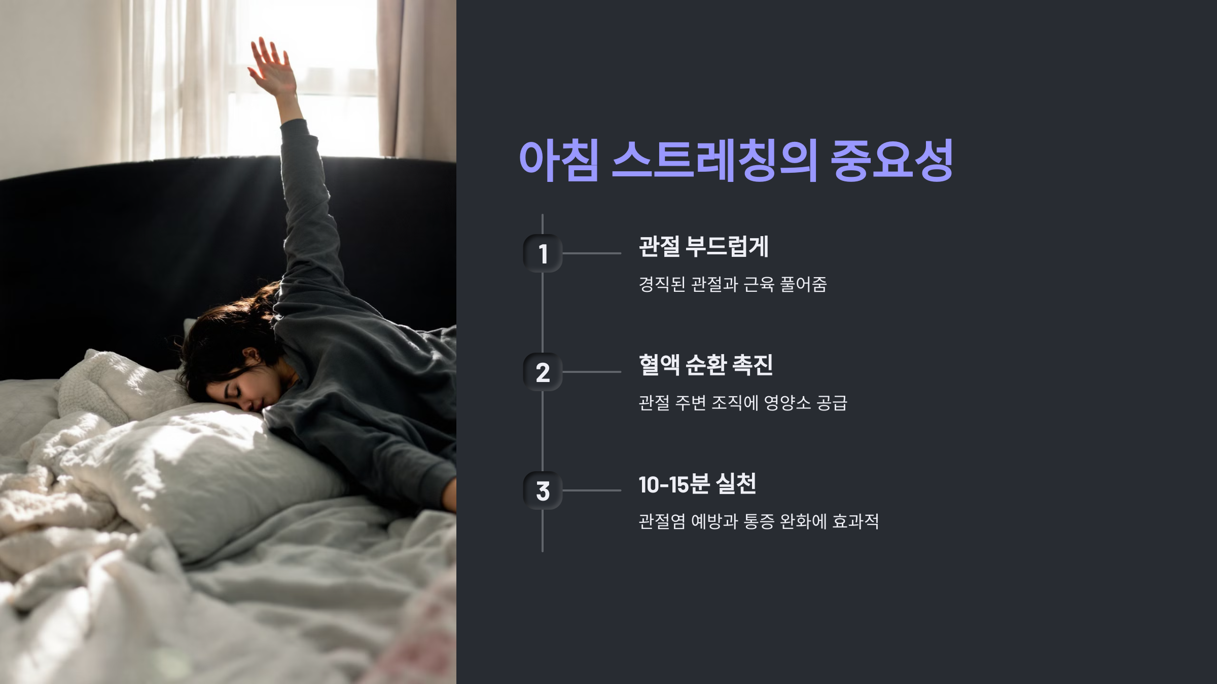 아침 스트레칭은 관절을 부드럽게 하고 하루의 시작을 활기차게 만드는 데 도움을 줍니다.