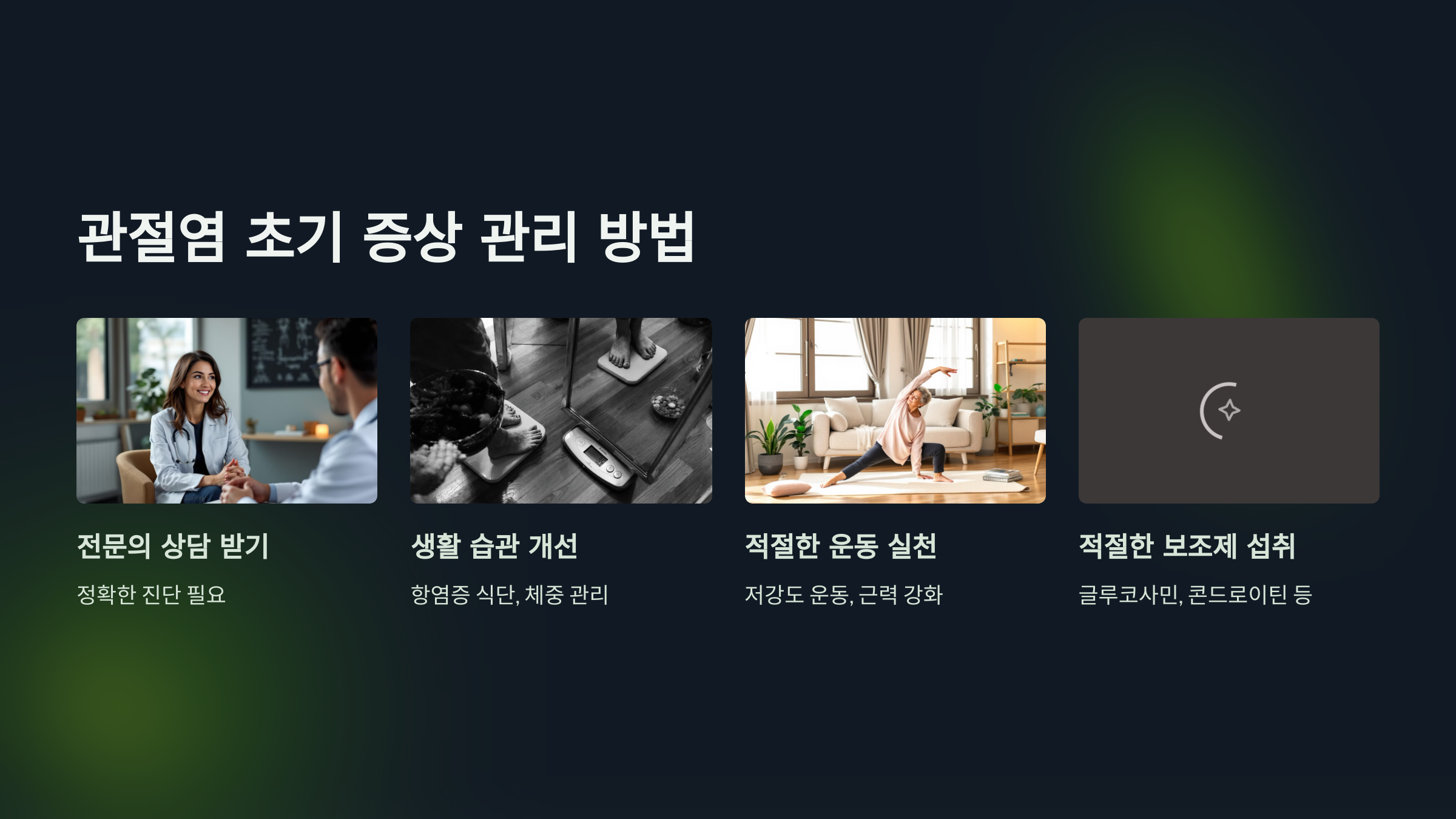 - 관절 건강 보조제를 꾸준히 복용하며 관절 보호를 강화하세요.