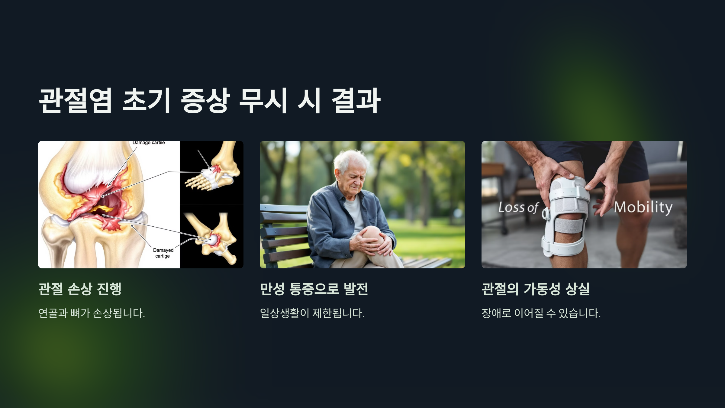 관절염 초기 증상을 방치하면 염증이 관절 연골과 뼈를 손상시킬 수 있습니다. 이는 관절 기능의 회복을 어렵게 만듭니다.