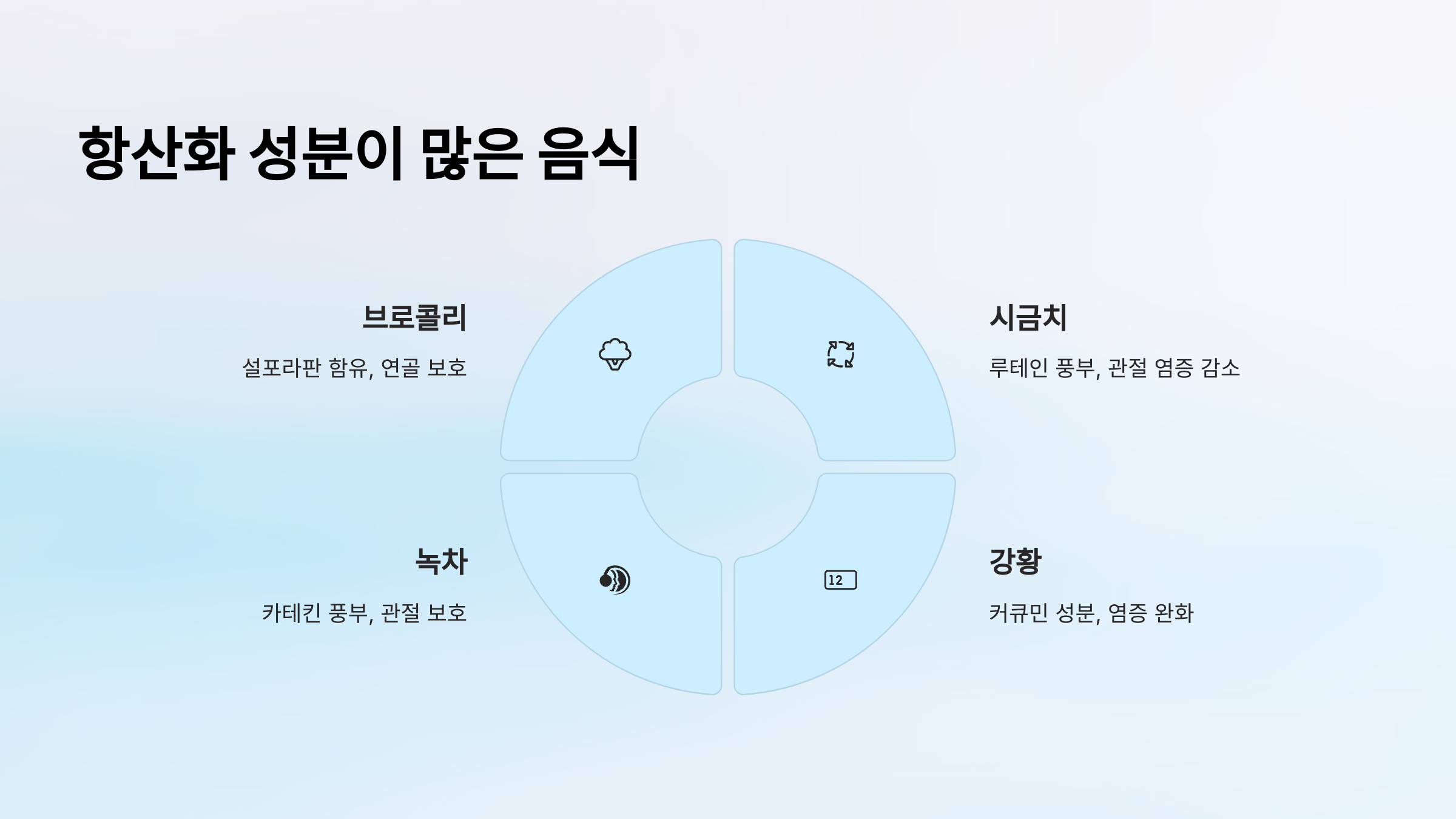 항산화 성분은 관절과 연골을 손상시키는 활성산소를 제거해 줘요. 활성산소는 연골을 마모시키고 염증을 유발할 수 있기 때문에 항산화 성분이 풍부한 음식을 섭취하는 것이 중요해요.