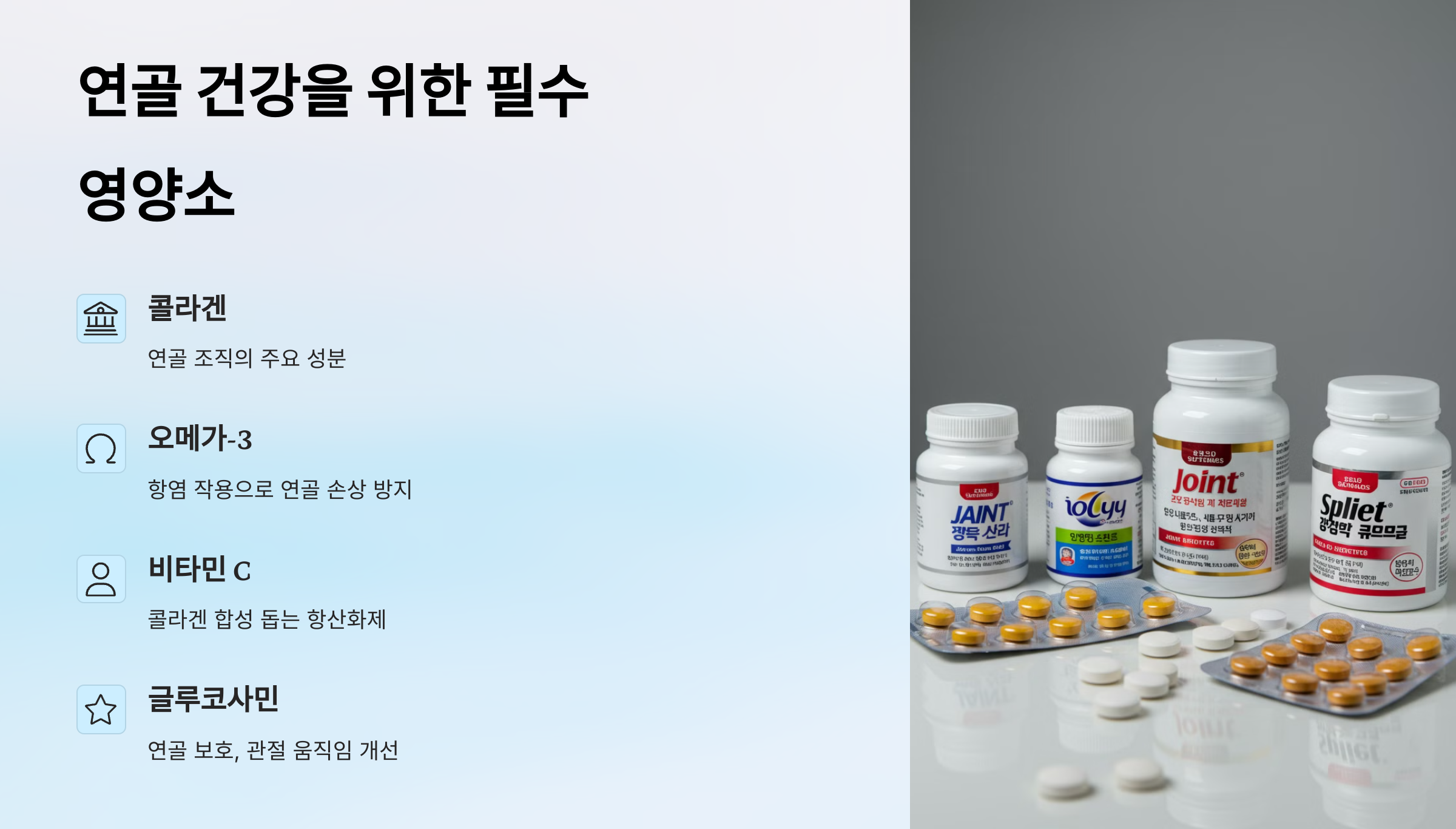 연골 건강을 위해 꼭 섭취해야 하는 영양소가 있어요. 이 영양소들은 연골을 보호하고 재생을 돕는 역할을 해요.