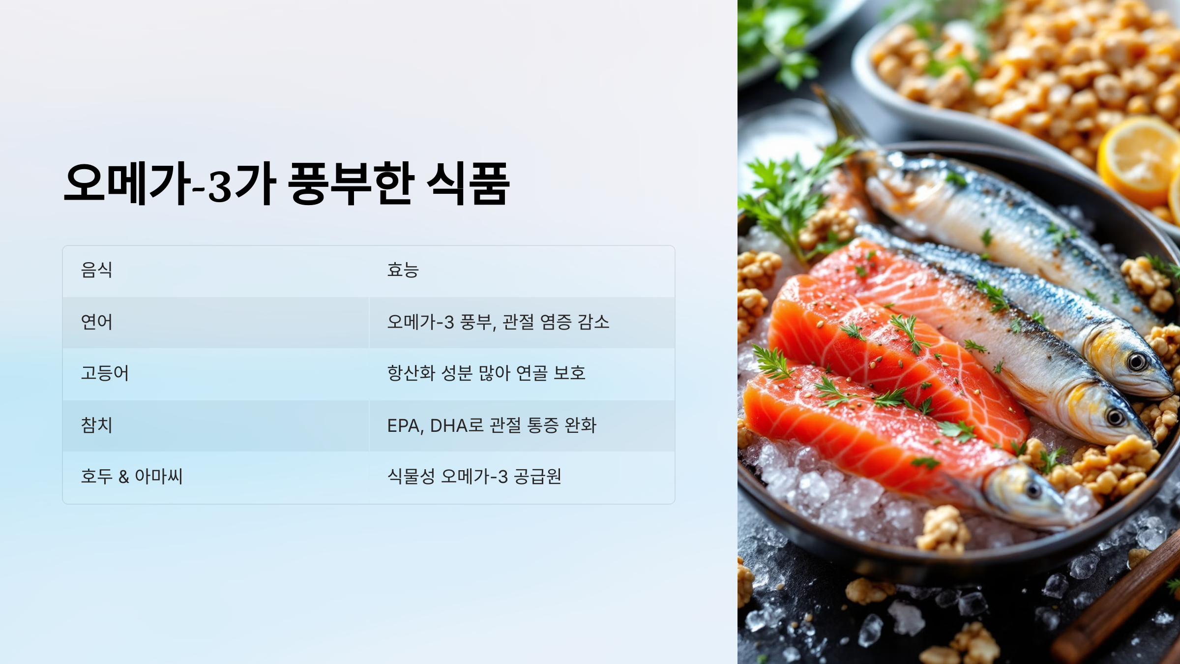 | 참치 | EPA, DHA 함유로 관절 통증 완화 |