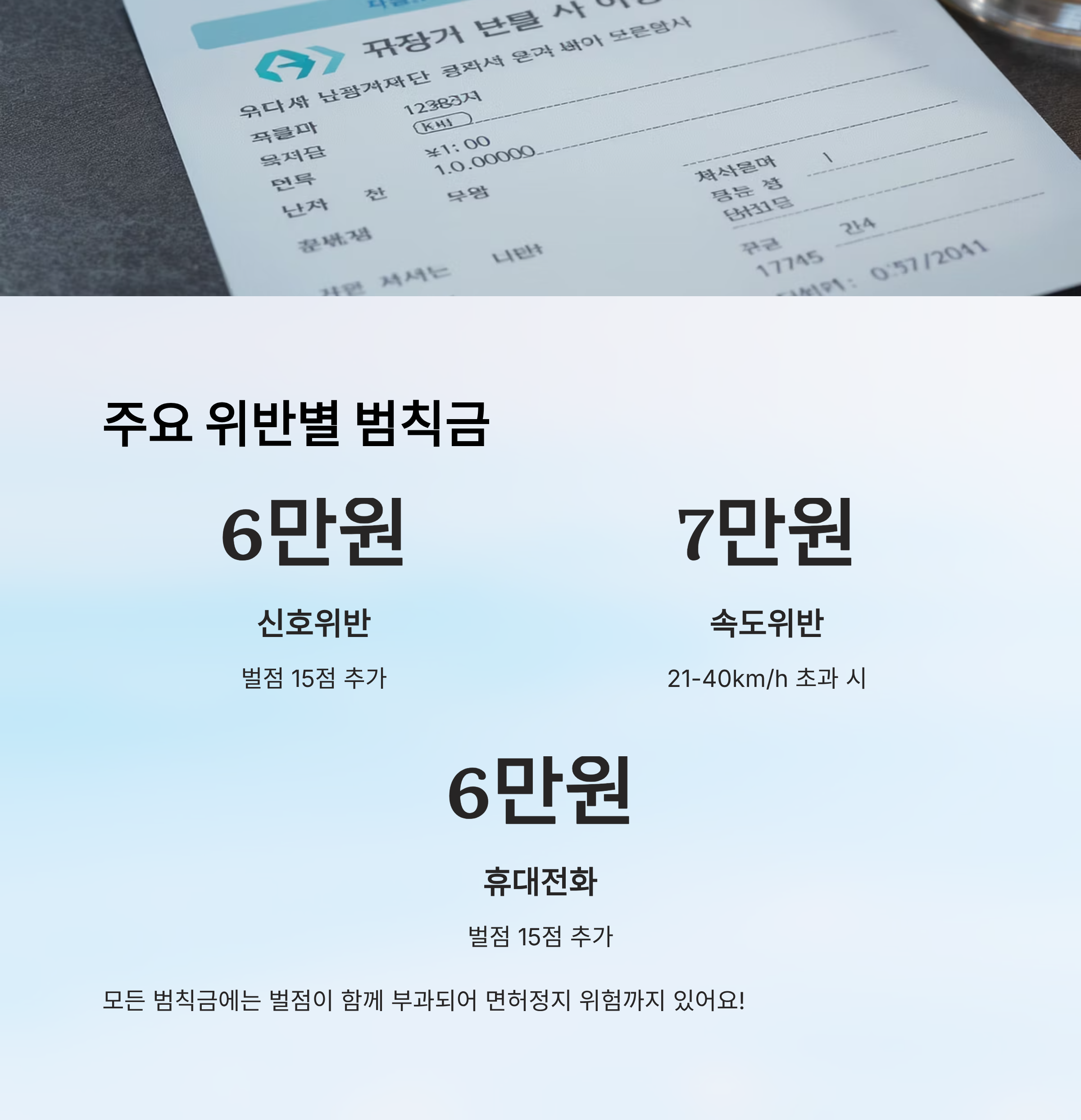 **운전 중 휴대전화 사용**은 6만~7만 원 범칙금과 함께 벌점 15점이 부과돼요. 이처럼 단순히 금전적 부담만이 아닌 면허정지 누적 벌점으로도 이어질 수 있어서 절대 가볍게 보면 안 되는 항목이에요.