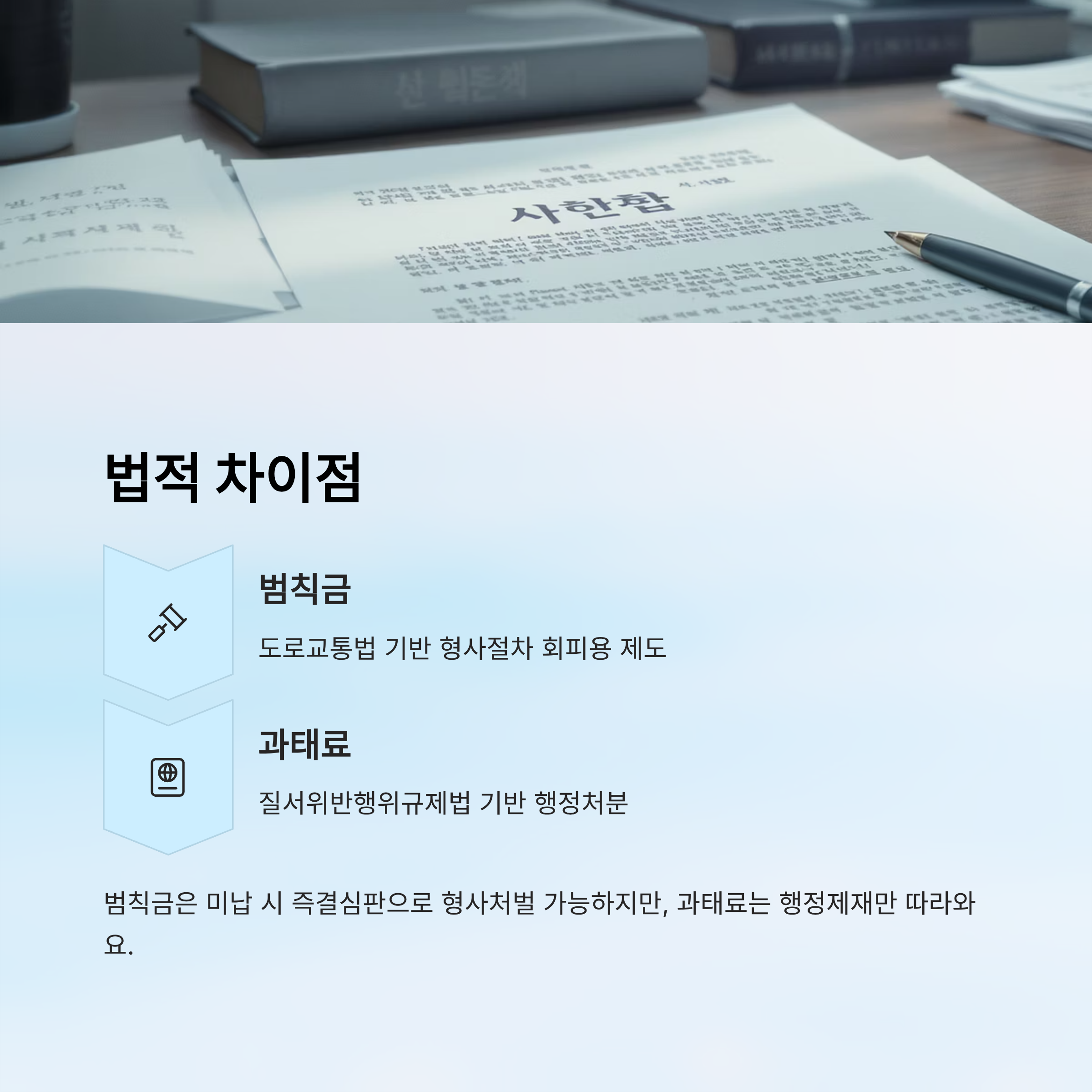 정리하자면, 범칙금은 경미한 형사책임 회피용 제도, 과태료는 질서 위반에 대한 행정 제재. 적용 법령도 다르고 후속 조치도 다르다는 걸 꼭 기억해두세요.⚖️