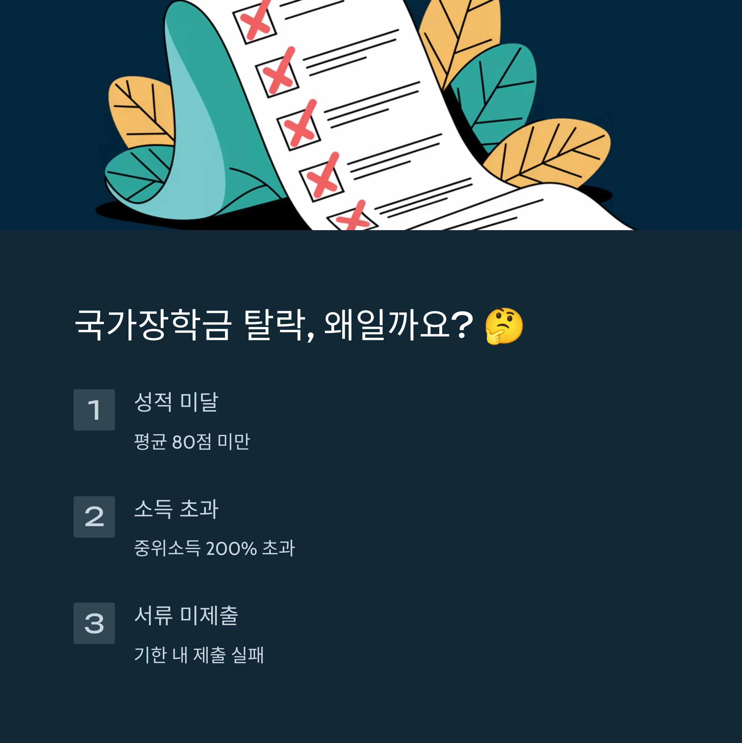 2️⃣ **소득분위 초과**: 국가장학금은 소득 8분위 이하 학생들에게 지급돼요. 소득이 기준을 초과하면 탈락할 수 있어요.