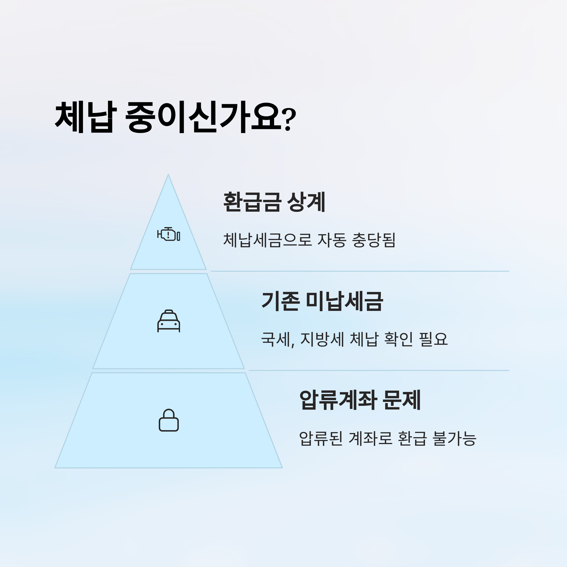 A3. 불가능해요. 환급금은 자동으로 체납 세금에 먼저 충당돼요. 체납을 먼저 납부해야 환급 가능해요.