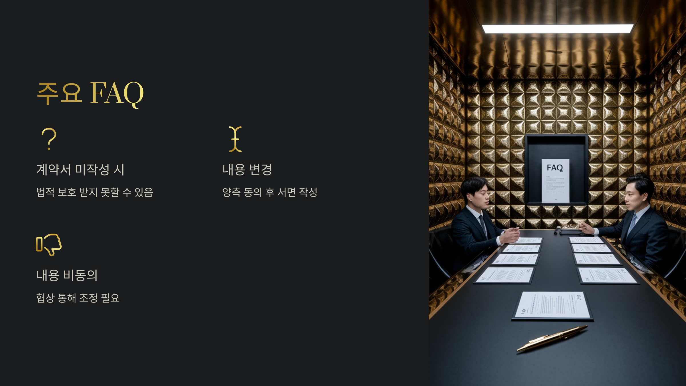 A2. 계약서 내용 변경 시 양 당사자가 동의해야 하며, 이를 서면으로 작성하고 서명을 다시 받아야 합니다. 구두 합의는 법적으로 효력이 없을 수 있습니다.