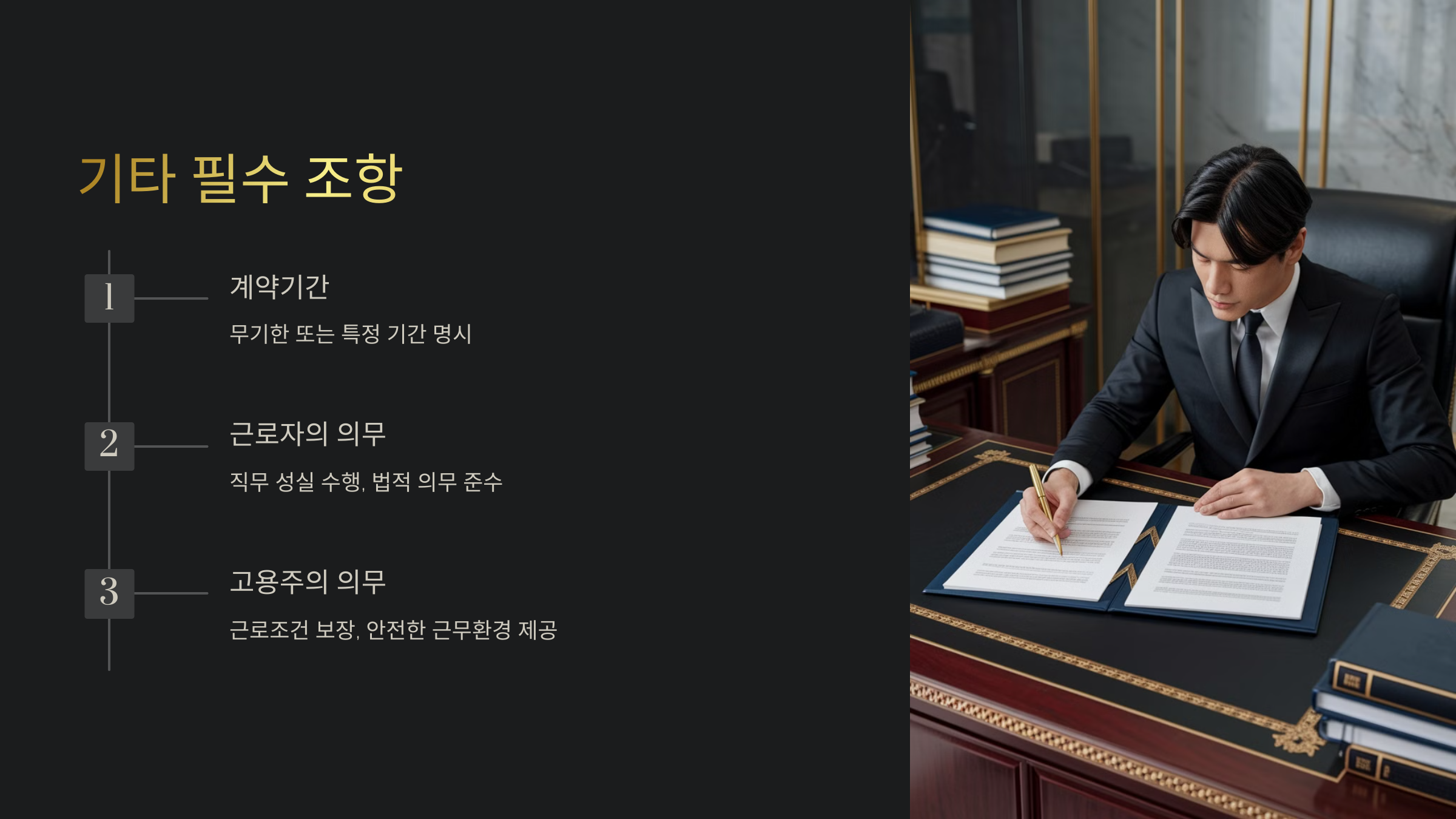 근로계약서에는 다양한 항목들이 포함될 수 있지만, 필수적으로 포함해야 할 기본적인 조항들이 있습니다. 이들 항목은 근로자의 권리와 고용주가 지켜야 할 의무를 명확히 하여 양측 간의 분쟁을 예방합니다. 각 항목은 근로계약서 작성 시 빠짐없이 확인하고 기재해야 합니다.