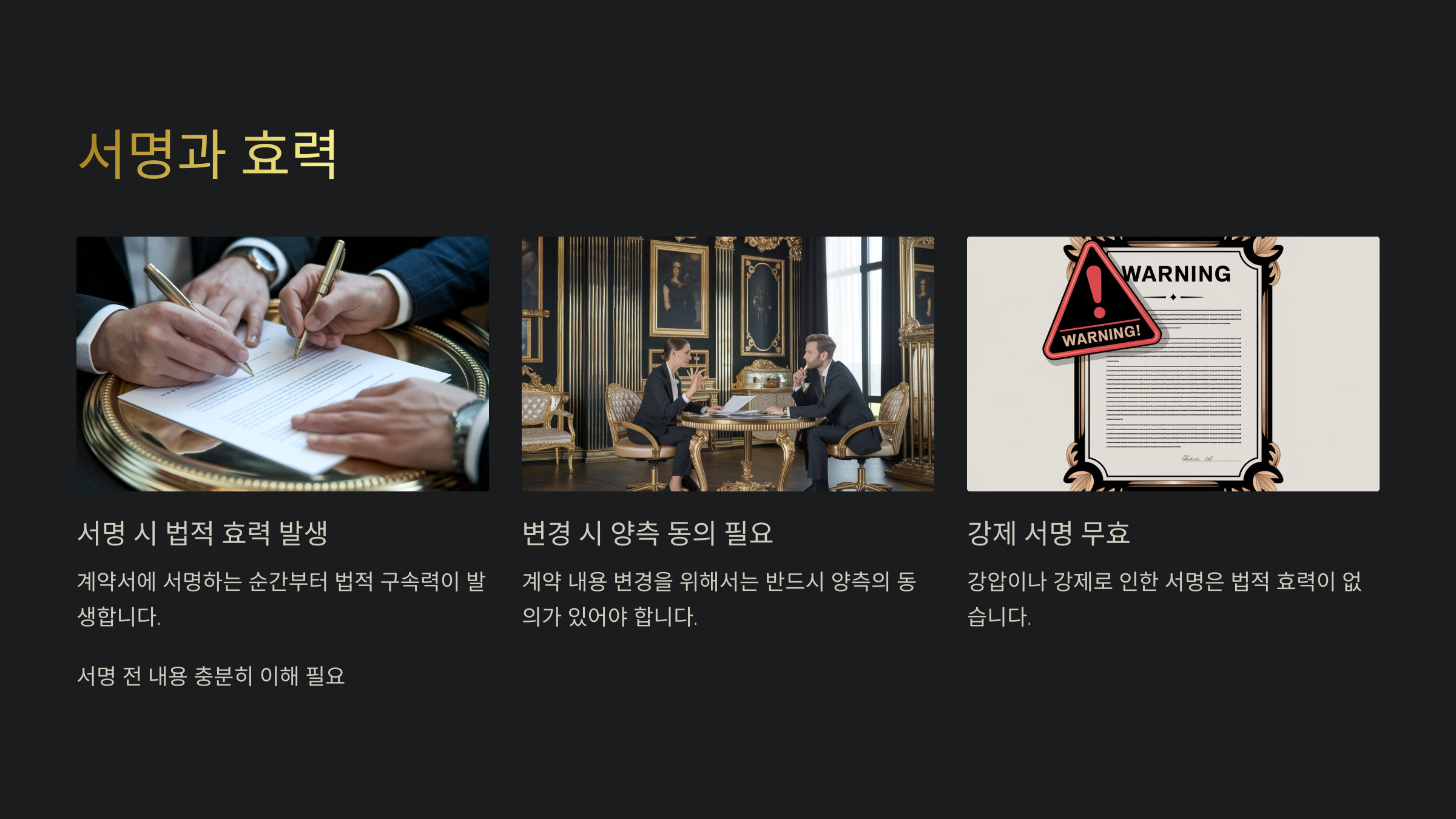 서명 후, 계약서의 내용에 대해 변경이 필요할 경우, 양 당사자의 동의 하에 변경 사항을 반영한 계약서를 새로 작성하고 서명을 다시 받아야 합니다. 이렇게 변경된 계약서는 원래 계약서와 동일한 법적 효력을 가지며, 이후에 발생할 수 있는 모든 법적 분쟁에 있어서 중요한 역할을 하게 됩니다.