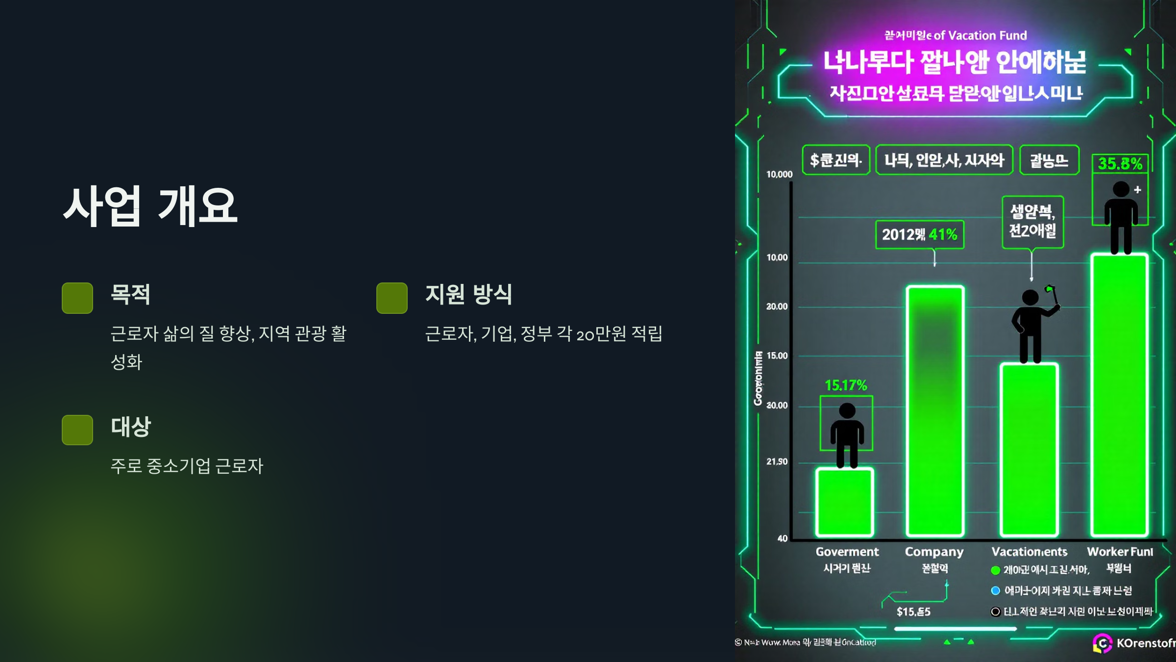 근로자가 일정 금액(예: 20만 원)을 적립하면, 기업과 정부가 각각 같은 금액을 추가 지원하여 총 60만 원의 여행 예산을 마련할 수 있습니다.