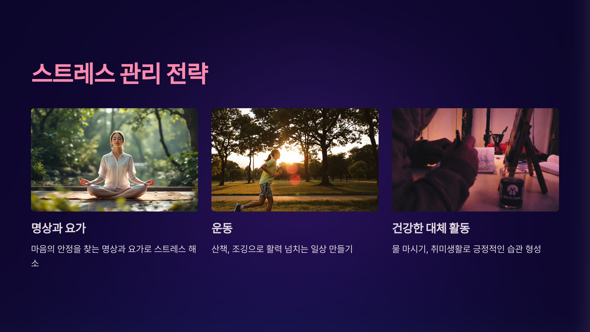 - 운동: 산책, 조깅 등으로 스트레스 해소