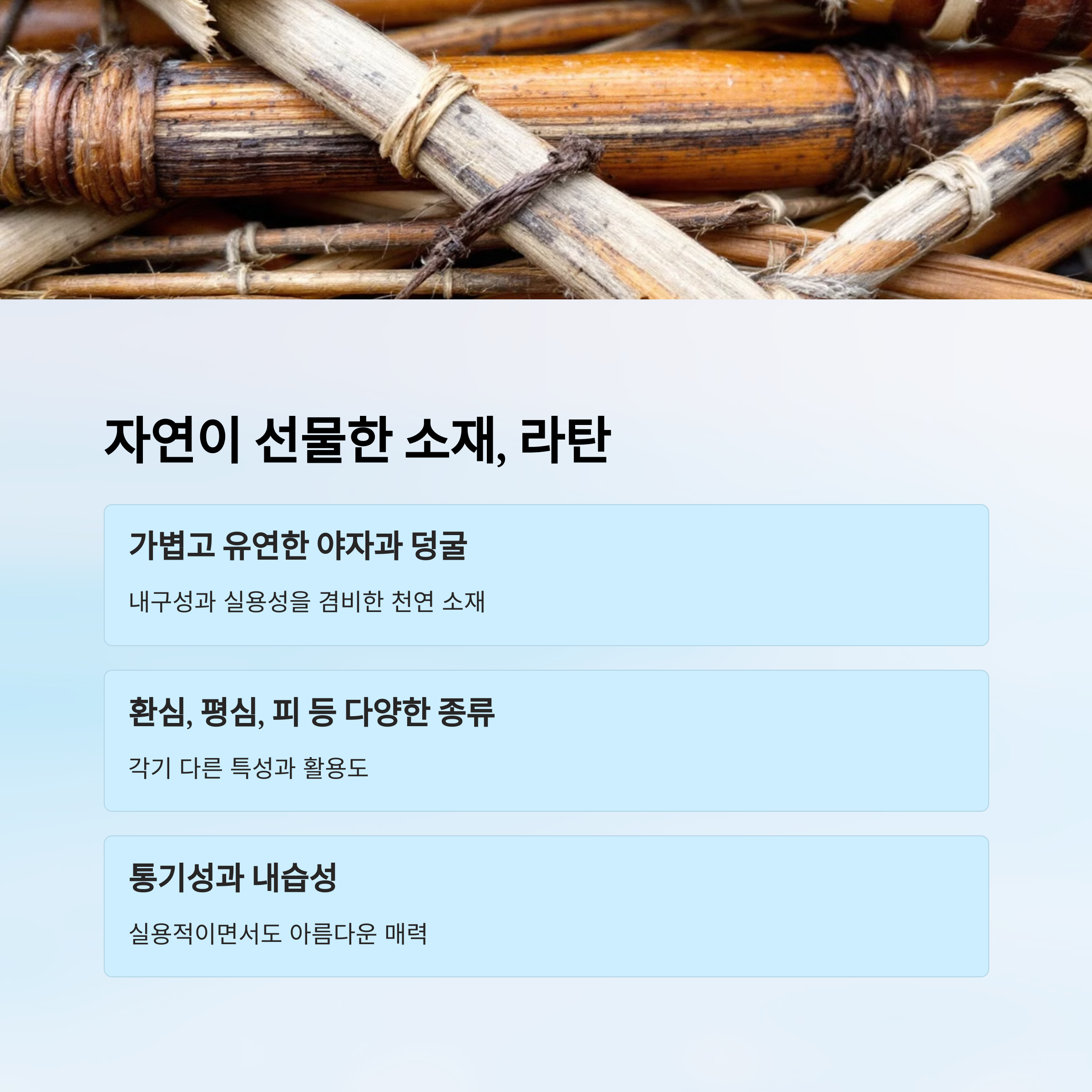 라탄은 자연에서 얻는 친환경 소재로, 나무처럼 보이지만 사실은 덩굴 식물이에요. 그렇기 때문에 유연하면서도 가볍고, 심지어 물에도 강한 편이죠. 특히 라탄은 열대기후에서 자라기 때문에 그 탄성과 내구성이 매우 뛰어나요. 그래서 오래 사용해도 쉽게 부러지지 않고 형태를 잘 유지해준답니다.