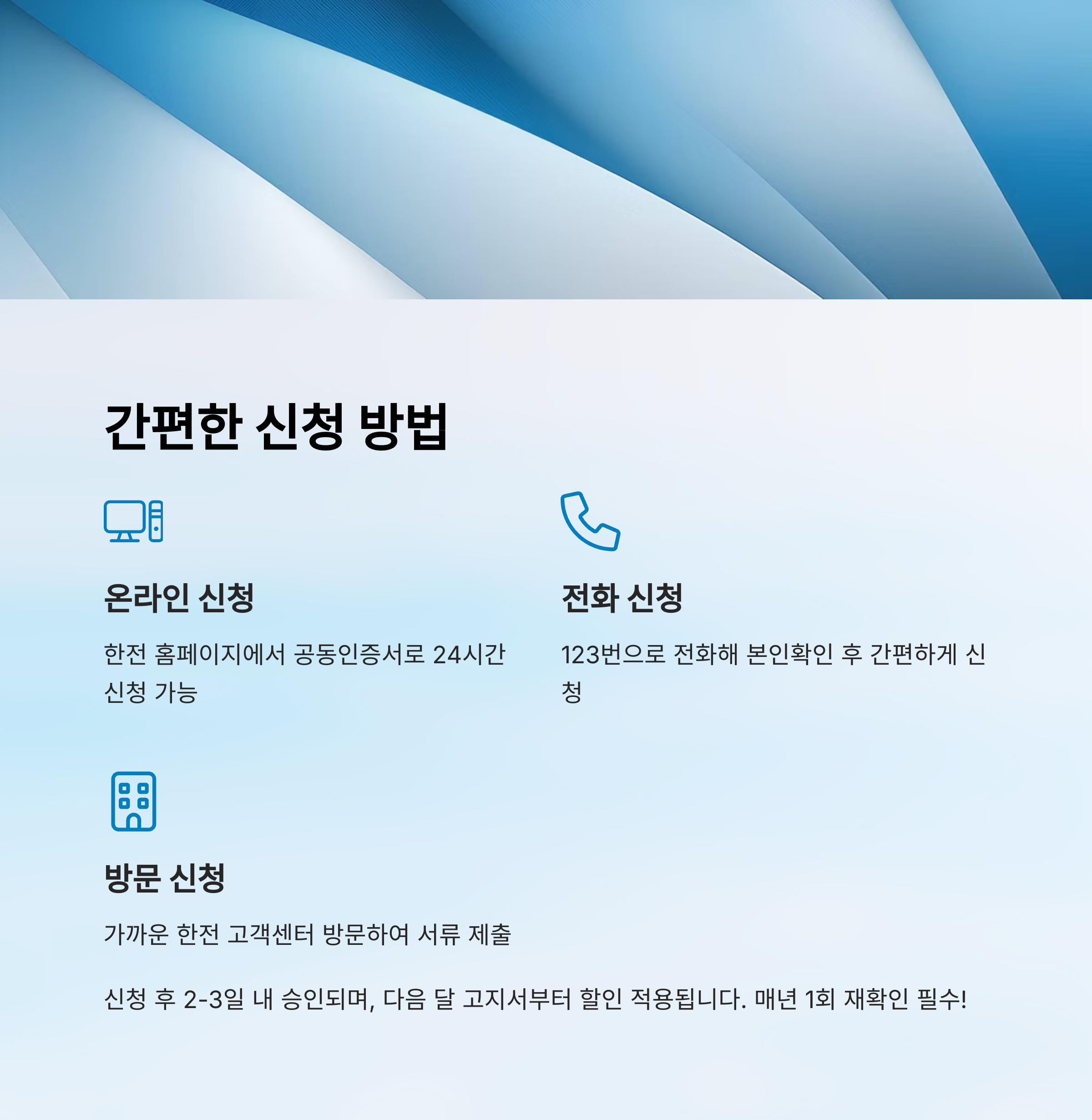 주의할 점은 ‘1세대 1계약’ 원칙이에요. 한 집에 두 개 이상의 전기계약이 있을 경우 할인은 하나의 계약에만 적용돼요. 따라서 전기요금 고지서에 나오는 계약 번호를 정확하게 확인해서 신청하는 것이 중요해요 ⚡